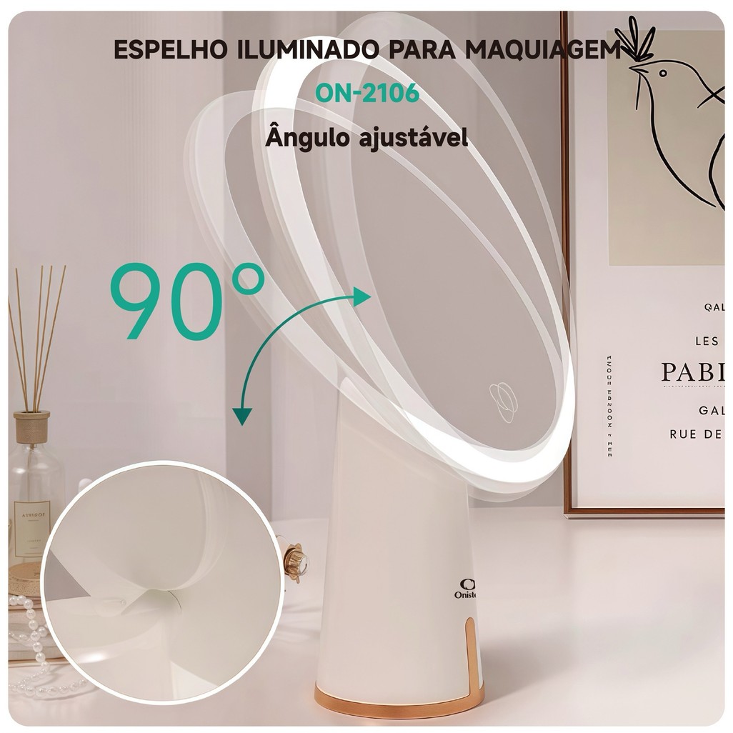 Espelho iluminado para maquiagem oferece iluminação uniforme e precisa para aplicação de maquiagem, cuidados pessoais e rotinas de beleza no dia a dia. Possui design moderno, compacto e funcional, com luz de LED integrada que proporciona melhor visualização do rosto em diferentes ambientes. Conta com controle de iluminação ajustável, permitindo selecionar a tonalidade e intensidade de luz conforme a necessidade, além de ângulo regulável que garante maior conforto durante o uso. Ideal para uso em casa ou em viagens, combinando praticidade, eficiência e portabilidade. ESPECIFICAÇÕES GERAIS: - Tipo: espelho iluminado para maquiagem - Iluminação: LED integrada - Cores de luz: 3 cores de luz - Níveis de brilho: 3 níveis ajustáveis - Ângulo ajustável: sim - Rotação: até 90° - Alimentação: via USB - Capacidade da bateria: 1200 mAh - Design: leve e portátil - Uso indicado: maquiagem e cuidados pessoais DIMENSÕES: - Diâmetro do espelho: 195 mm - Altura total: 280 mm - Base: 77 mm CONTEÚDO: - 01 Espelho iluminado para maquiagem - 01 Cabo USB para alimentação