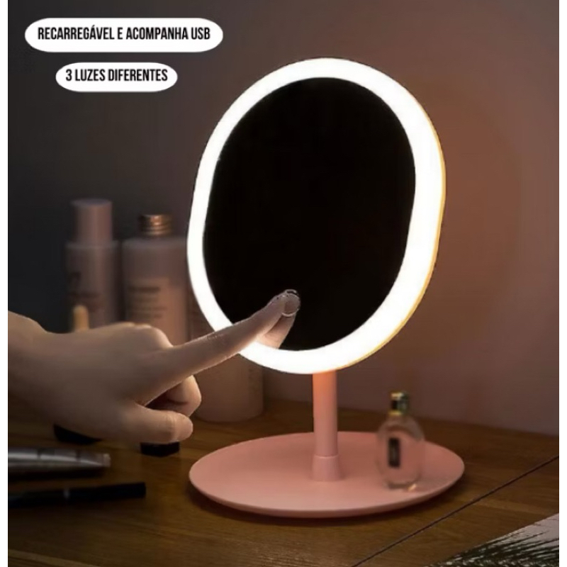 Espelho Decorativo com LED de Mesa redondo Cores: Rosa e Branco (SORTIDO) Modelos: Quadrado, Oval e Redondo Lindo Espelho com luz de LED, perfeito para você que adora fazer sua maquiagem com mais definição, para cuidados com sua pele, sobrancelhas, ou até mesmo para auxiliar nos cuidados com a barba independente da luminosidade a sua volta. Produto com design moderno, possui botão de liga/desliga touch na parte frontal, para fácil acesso, rotação de 90º para melhor visualização do espelho. Sua base tem espaço para guardar ali pequenos objetos enquanto usa, auxiliando no manuseio do dia a dia, podendo colocar batons, pinça, brincos, anéis, etc. Por ser desmontável sua base, ocupa pouco espaço, ideal para guardar na mala ou em casa mesmo. Carregamento USB.