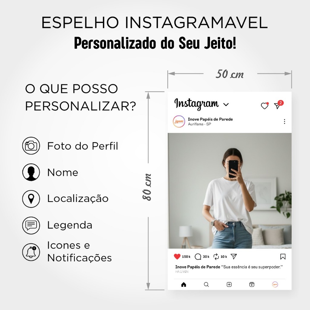 ✨ Espelho Grande Personalizado ✨ Este espelho grande é personalizado e ideal para uso no Instagram. Com dimensões de 80x50 cm, ele oferece um espaço amplo para suas fotos e vídeos. 📸Personalize:Apos compra informar no chat seguintes detalhes 1) nome de perfil e foto 2) localização da publicação (nome da cidade) 3) legenda desejada Características: Tamanho: 80x50 cm. Perfeito para quem busca um espelho grande para suas postagens no Instagram. 📏 Personalizado: Este espelho pode ser personalizado conforme suas necessidades. 🎨 Uso: Ideal para fotos e vídeos no Instagram. Aproveite o espaço amplo para criar conteúdo atraente. 📸✨