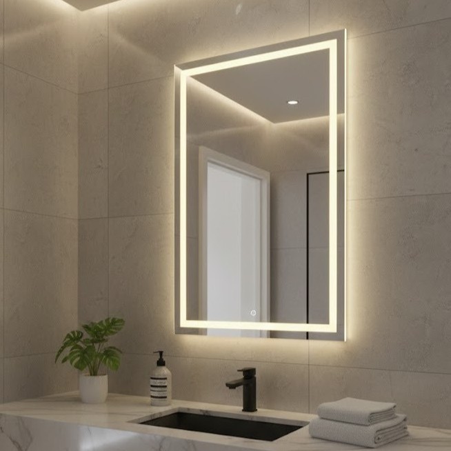 Espelho Grande com Led 3 cores e Touch Jateado Fino 70x50cm Lapidado para Banheiro e Decoração