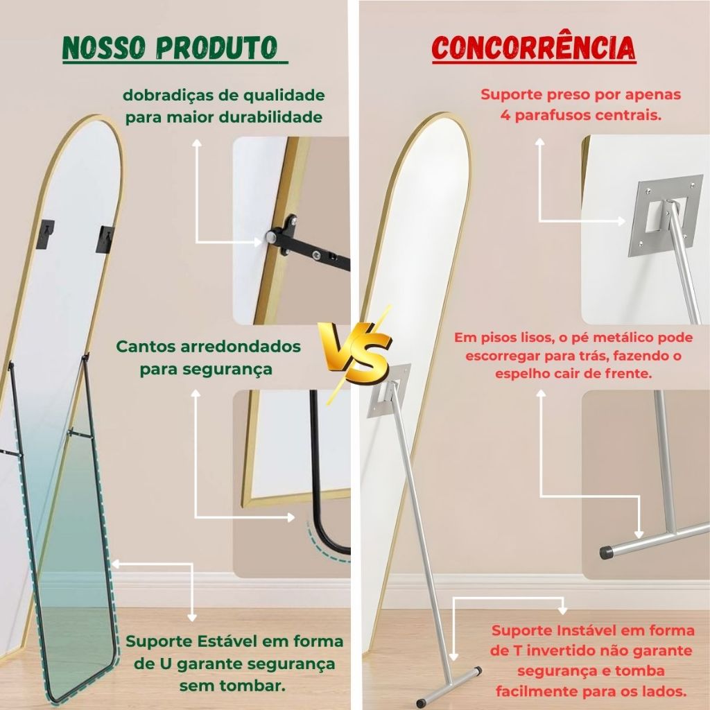 Espelho Grande de Chão Oval com Moldura em Alumínio – Corpo Inteiro, Sofisticado e Versátil Transforme seus ambientes com o Espelho Grande de Chão Oval com Moldura em Alumínio, perfeito para quem busca elegância, praticidade e um toque moderno na decoração. Ideal para quartos, closets, salas de estar, estúdios e ambientes comerciais, este espelho de corpo inteiro oferece um visual sofisticado e funcional para o seu dia a dia. Com 1,46 m de altura e 36 cm de largura, ele proporciona visão completa para se vestir, se maquiar ou compor looks com conforto e precisão. O modelo oval possui moldura em alumínio disponível nas cores dourado e prata, garantindo durabilidade e acabamento refinado. O espelho acompanha suporte para chão e suporte para parede, permitindo instalação versátil conforme sua necessidade. É fácil de montar e já vem pronto para uso, com todos os itens inclusos. Características Principais: • Espelho de corpo inteiro • 1,46 m de altura x 36 cm de largura • Moldura oval em alumínio • Pode ser usado no chão ou pendurado na parede • Inclui suporte de chão e suporte de parede • Fácil de montar • Ideal para quartos, closets, salas e espaços decorativos • Peso aproximado: 2,5 kg Conteúdo da Embalagem: • 1 Espelho de corpo inteiro • 1 Suporte para chão já montado • 1 Suporte para parede já montado • 2 Parafusos e 2 buchas de fixação • Embalagem reforçada com isopor, papelão e identificação de frágil