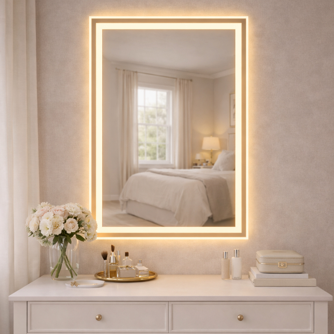 Espelho Retangular com LED Jateado 80x50cm – 3 Tons de Luz | Moderno e Sofisticado ✨ Transforme seu ambiente com um espelho elegante, funcional e com iluminação inteligente. Este modelo conta com 3 tonalidades de LED em um único espelho, permitindo escolher a luz ideal para cada momento: ➡️ Luz Branca (Fria) ➡️ Luz Amarela (Quente) ➡️ Luz Neutra Tudo acionado facilmente pelo botão touch screen. Pode ser instalado tanto na horizontal quanto na vertical, se adaptando perfeitamente ao seu espaço. ✅ Características Principais: • Medida: 80x50cm • Borda lapidada com acabamento premium • Faixa jateada elegante (2,5 cm de largura) • Vidro de 3 mm de alta resistência • Iluminação LED integrada (bivolt automático) • Acionamento Touch Screen moderno • Instalação prática (alvenaria, drywall ou móveis planejados) • Resistente a respingos – ideal para banheiros e lavabos 💡 Diferenciais: ✔ 3 tons de LED em um único produto ✔ Design moderno e sofisticado ✔ Baixo consumo de energia ✔ Iluminação perfeita para maquiagem, skincare e barbear ✔ Garantia de 1 mês contra defeitos de fabricação 👉 Ideal para: Banheiro • Lavabo • Penteadeira • Closet • Espaços modernos