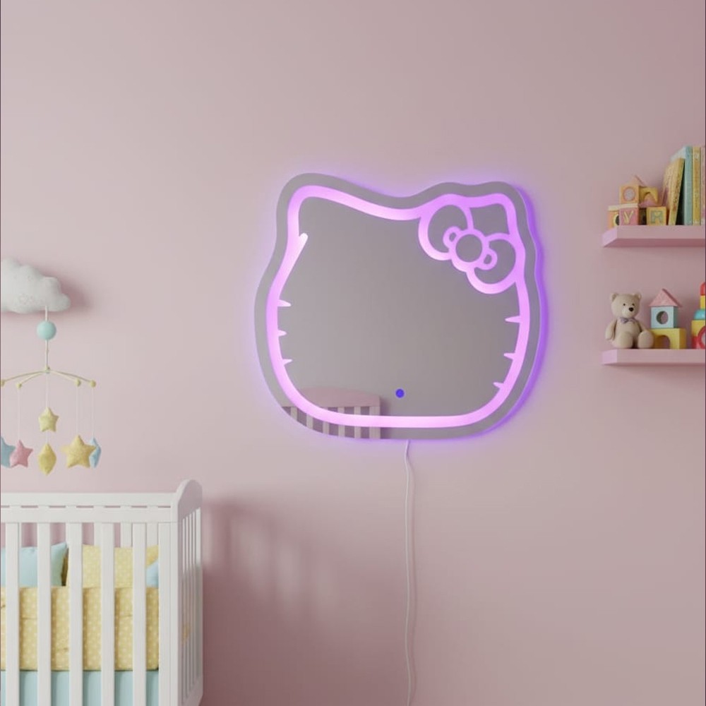 Espelho Jateado Gatinho Infantil Gato Hello Kitty 70x65cm Led Touch Três Tons Rosa Branco e Amarelo
