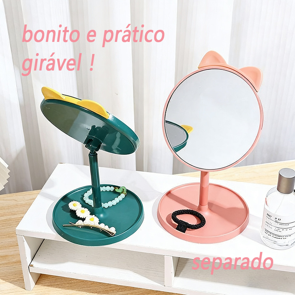 Espelho Mesa Penteadeira Gatinha Redondo com Rotação 360º Bandeja Multifuncional e Pente Oculto Fofo para Maquiagem