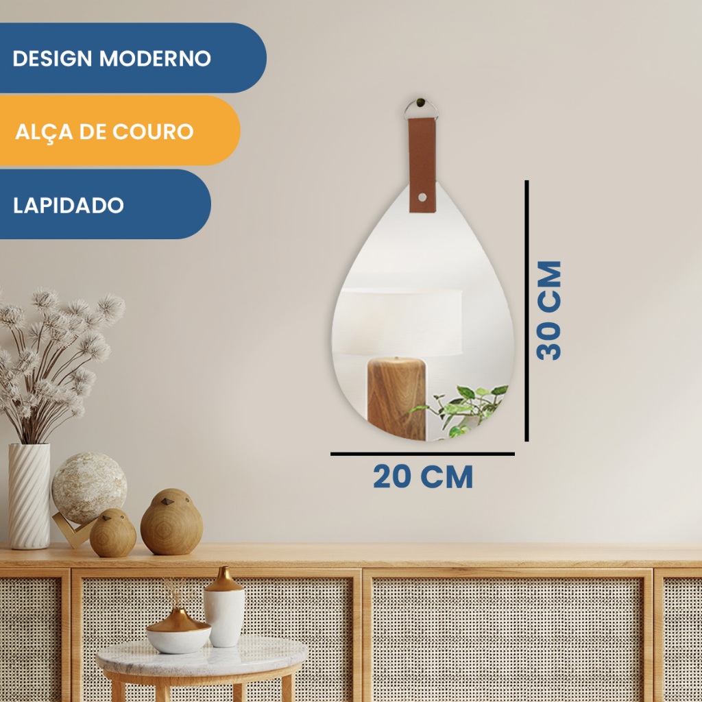 Espelho Organico Gota Lapidado com Alça de Couro 30x20cm – Ideal para Lavabo, Sala e Quarto