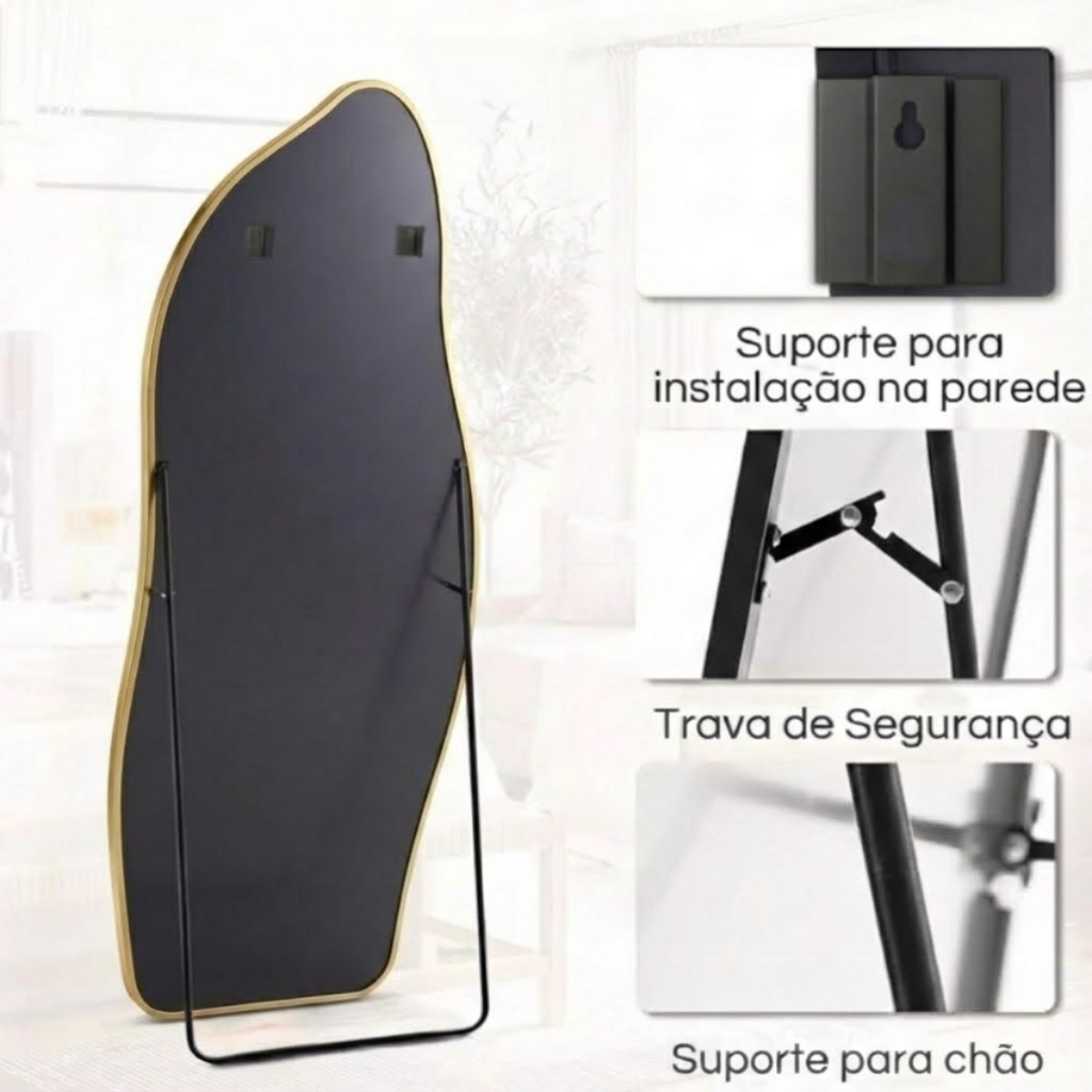 TRANSFORME SUA CASA COM A ELEGÂNCIA DAS FORMAS NATURAIS E ORGÂNICAS O design de interiores evoluiu e as linhas retas deram lugar à fluidez. Nosso Espelho Orgânico Premium não é apenas um item funcional, mas uma peça de arte que amplia o ambiente, melhora a iluminação natural e traz sofisticação imediata para sua sala, quarto ou provador. Com acabamento impecável e versatilidade total, ele se adapta exatamente ao seu estilo. Principais Benefícios: Versatilidade 3 em 1: Use-o com o suporte de chão (incluso), pendurado na parede como um quadro ou apenas encostado para um visual despojado e moderno. Amplitude e Luminosidade: O formato irregular e a alta qualidade do cristal garantem um reflexo perfeito, sem distorções, ideal para "ampliar" espaços pequenos. Segurança Reforçada: Equipado com trava de segurança no suporte de chão e suportes robustos para instalação na parede, garantindo estabilidade total em qualquer configuração. Ficha Técnica: Material: Moldura em liga metálica de alta resistência com pintura eletrostática (não descasca). Tamanhos Disponíveis: $170 \text{cm} \times 70 \text{cm}$ | $150 \text{cm} \times 60 \text{cm}$ | $110 \text{cm} \times 50 \text{cm}$. Cores: Marrom, Off White, Dourado, Bronze, Preto e Prata. Instalação: Multifuncional (Parede, Suporte de Chão ou Encostado). Itens Inclusos: 01 Espelho Orgânico, Suporte de Chão pré-instalado, Kit de fixação para parede. Perguntas Frequentes (Quebra de Objeções): O espelho distorce a imagem? R: Não. Utilizamos cristal de alta qualidade que garante um reflexo fiel e nítido. É seguro para casas com crianças? R: Sim, possui trava de segurança no suporte e estrutura reforçada para evitar quedas. Já vem pronto para usar? R: Sim, o suporte de chão já vai montado. Se preferir na parede, o kit de instalação acompanha o produto. espelho organico, espelho de chão, espelho decorativo, espelho grande, espelho corpo inteiro, decoração sala, espelho moldura dourada, espelho preto, espelho quarto, espelho irregular, espelho tendencia, design de interiores, espelho luxo, espelho provador, espelho closet, espelho moldura metal, espelho bronze, espelho off white, espelho prata, espelho moderno