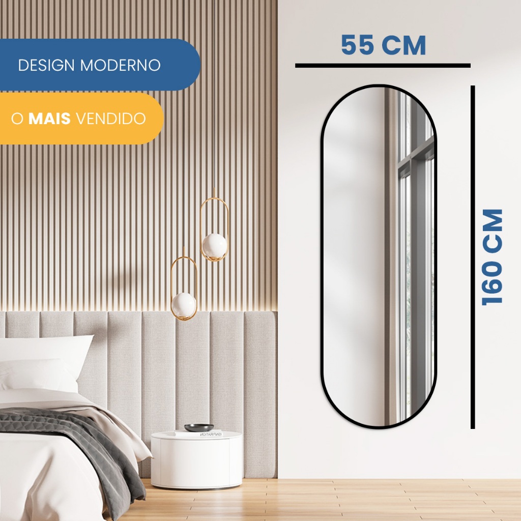 Espelho Vertical Moderno 160x55 cm – Elegância e Versatilidade para Seu Ambiente Transforme qualquer espaço com este espelho vertical moderno, projetado para unir funcionalidade e estilo. Com dimensões de 160 cm de altura por 55 cm de largura, ele amplia visualmente o ambiente, trazendo mais luminosidade e sensação de amplitude. Especificações Técnicas: Dimensões: 160 cm (altura) x 55 cm (largura) Material: Vidro de alta qualidade, 3 mm de espessura Estilo: Moderno, contemporâneo Cor da Moldura: Preta ou Caramelo Ambientes Recomendados: Sala de estar, quarto, hall de entrada, corredor, escritório Cuidados: Limpar com pano macio e seco; evitar produtos abrasivos Características: Design Contemporâneo: Bordas retas com cantos levemente arredondados, proporcionando um visual sofisticado e suave. Dimensões Ideais: Tamanho perfeito para valorizar espaços e criar profundidade no ambiente. Versatilidade: Adapta-se facilmente a diferentes ambientes e estilos de decoração. Fácil Instalação: Acompanha suportes para fixação segura na parede. Benefícios: Ampla Aplicação: Funcional e decorativo, tornando-se destaque em qualquer espaço. Sensação de Espaço: Amplia visualmente o ambiente, aumentando a luminosidade. Elemento Decorativo: Acrescenta personalidade e estilo à decoração. Presente Sofisticado: Ideal para presentear em ocasiões especiais, agradando aos mais exigentes gostos.