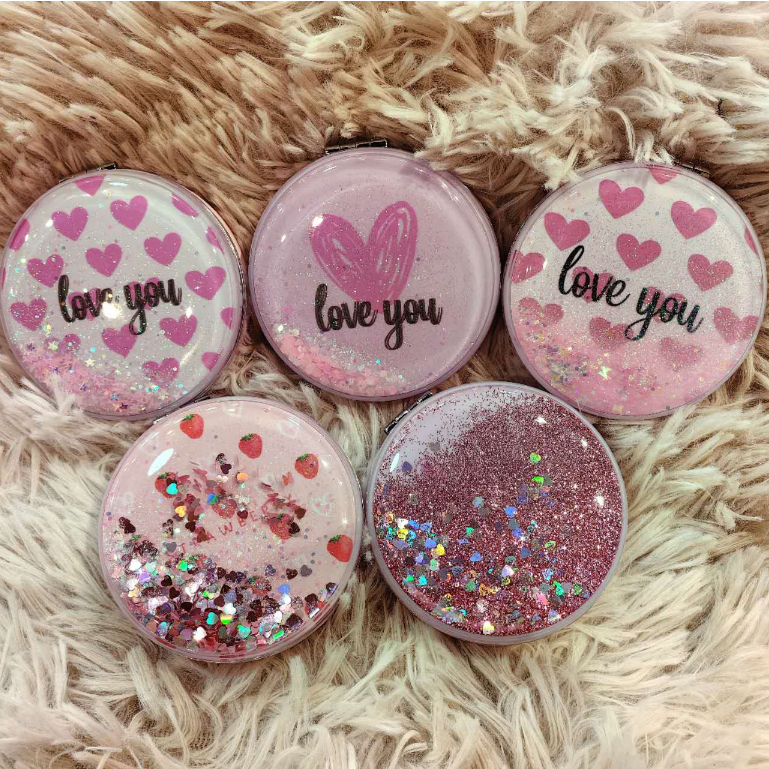 Espelho para Bolsa com Glitter e Água. Contém dois espelhos: um comum e outro com lente de aumento. Tamanho: 7cm x 7cm