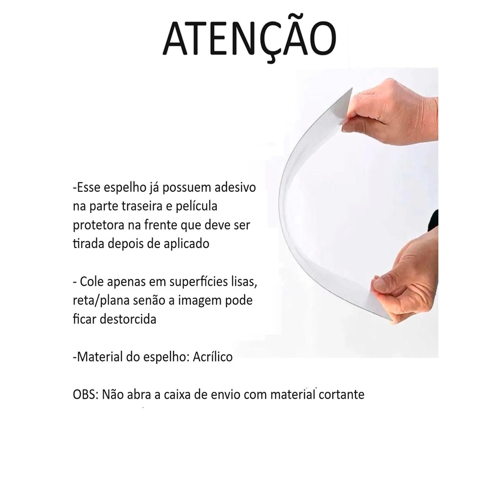 O espelho adesivo decorativo é uma tendência moderna e prática para aplicar em diversos ambientes. É tão claro como o espelho, trazendo um efeito decorativo perfeito. Além disso, possui fácil aplicação e higienização. INSTRUÇÕES DE USO Certifique-se de que a superfície onde deseja instalar o adesivo esteja limpa e seca Retire a proteção adesiva localizada no verso (parte de trás) do produto Aplique o adesivo no local pressionando firmemente na parede Somente retirar a película protetora frontal (localizada na parte da frente), após a instalação DICA Pode ser instalado no quarto, banheiro, cozinha, sala ou em qualquer superfície lisa PARA LIMPEZA Utilize um pano limpo, macio e seco e caso necessário, use solução de água e sabão neutro. Não utilize produtos químicos, abrasivos, esponja de aço ou similares, pois estes produtos podem arranhar a superfície