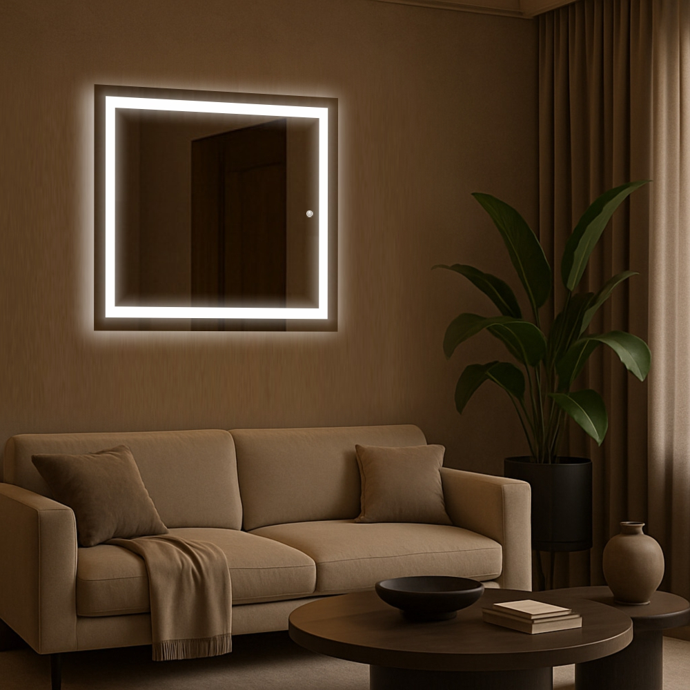 Espelho Quadrado 100cm x 100cm Led Jateado Touch Grande Decorativo Bivolt Sala Quarto Banheiro Hall Hotel 3 TONS DE LED