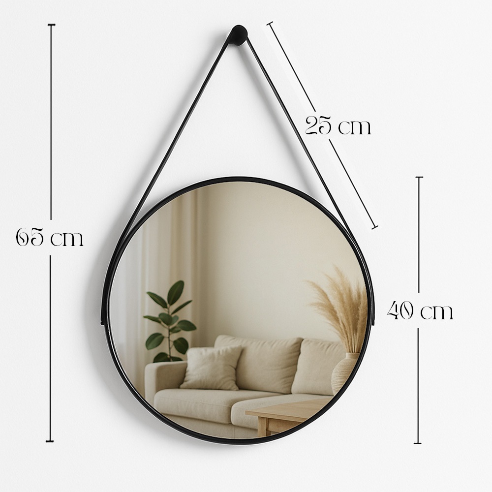 Espelho Redondo 40cm com Alça de Couro Ecológico e Suporte