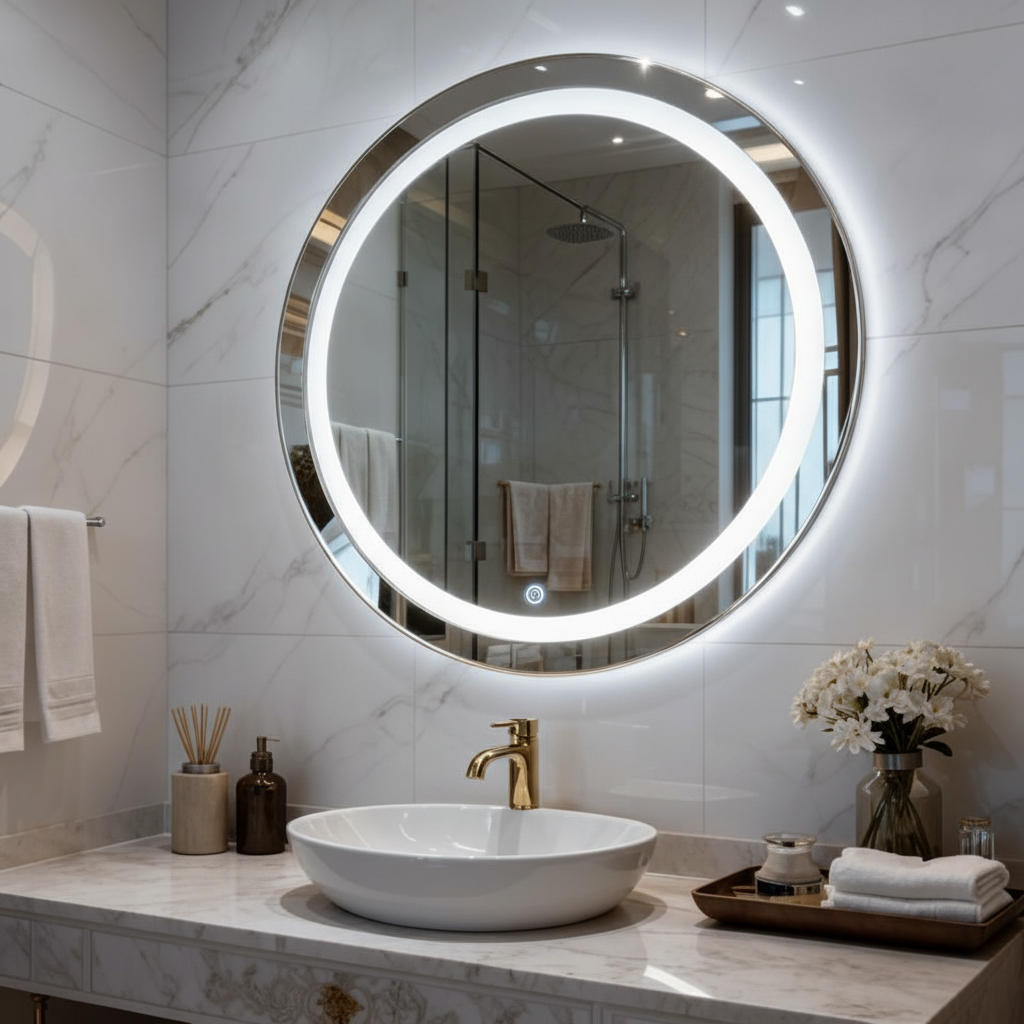 Espelho Redondo Jateado com Led e botão Touch para Maquiagem Penteadeira Banheiro Lavabo