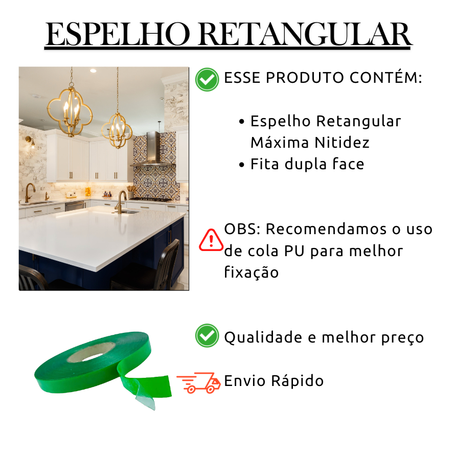 Espelho Retangular 40x30cm Máxima Nitidez + Fita Dupla-Face - Banheiro, Maquiagem, Sala, Quarto