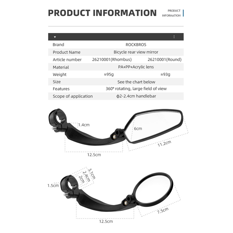 Marca: ROCKBROS Nome do produto: espelho retrovisor da bicicleta Material: PA + PP + lente acrílica Peso: 95g Tamanho:ver o gráfico abaixo Âmbito de aplicação: guidão de 2-2,4 cm Características: 1.360° Girando, grande campo de visão 2.Visão Grande, Fique fora do ponto cego 3.Base ajustável, ampla compatibilidade 4.Espelhos redondos são de grande angular, espelhos de diamante são espelhos planos
