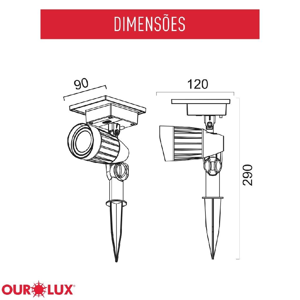 O Espeto LED Solar é a opção ideal para realçar diversos ambientes com pontos de luz. Com ele, você desfruta de todas as vantagens da energia solar em um dispositivo luminoso com um design feito especificamente para iluminar áreas externas como, jardins, fachadas, piscinas e outros locais, pois tem proteção contra água e poeira. Além de funcionar 100% com energia renovável este produto é Plug & Play e tem um direcional vertical, o que garante a facilidade na hora de instalar e o direcionar corretamente a luz. Mantenha sempre limpa a superfície do painel solar, longe de detritos e poeira para permitir que a bateria recarregue. Se o Espeto Spot Solar para jardim Ourolux estiver coberto por detritos ou poeira ha muito tempo, limpe a superfície e deixe a bateria recarregar sob luz solar direta e total por pelo menos 6 a 7 horas para que possa manter a capacidade máxima. O ESPETO SPOT SOLAR PARA JARDIM Ourolux possui um painel solar que converte a luz solar em eletricidade. Durante o dia, a eletricidade convertida e armazenada nas baterias recarregáveis. A noite, o ESPETO SPOT SOLAR PARA JARDIM Ourolux e alimentado pelas baterias utilizando a eletricidade armazenada durante o dia. 0 tempo de operação depende da localização geográfica, das condições climáticas diárias e da estação. Para um desempenho ideal durante a noite, deixe a bateria carregar por 6 a 7 horas sob luz solar direta.