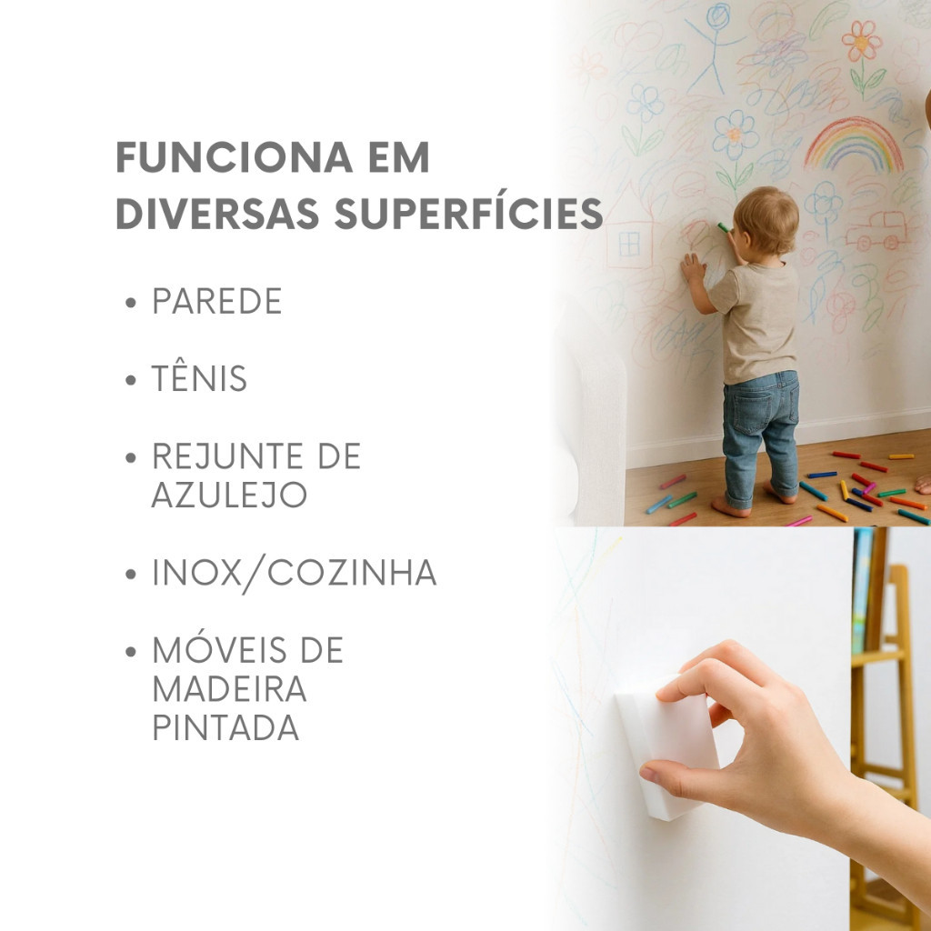 🚚 ENVIO IMEDIATO APÓS A COMPRA PARA TODO O BRASIL! Garantia do Vendedor: 30 Dias Produto: Esponja Mágica Bucha Melamina Multiuso Tira Manchas (Kit Atacado) 📦 Conteúdo da Embalagem: Kits disponíveis em atacado: 10, 20 ou 50 unidades 🔄 Variações: Kit 10 unidades Kit 20 unidades Kit 50 unidades 📐 Especificações Técnicas: Material: Espuma de Melamina (microabrasiva) Formato: Retangular padrão Medidas aproximadas: 10 x 6 x 2 cm Cor: Branca Tipo: Esponja multiuso para limpeza doméstica e profissional Sem uso de químicos – funciona apenas com água 🧽 Aplicações Indicadas: Remover rabiscos e sujeiras de paredes Esponja para limpar panelas cerâmica cozinha Esponja de limpar chão (pisos encardidos) Esponja limpa vidros (janela, box, espelho) Esponja mágica limpa sapatos (especialmente tênis branco) Limpeza de rejuntes, fogões, móveis e inox 💡 Principais Benefícios: ✅ Limpeza rápida e eficaz em diferentes superfícies (paredes, tênis, vidros, panelas e chão) ✅ Sem químicos agressivos – segura para toda a família ✅ Melhor custo-benefício – reutilizável até o desgaste, ainda mais vantajosa em kits atacado ----------------------------------------------------------------------------- Perguntas Frequentes - Preciso usar produtos de limpeza junto com a esponja? Não. A Esponja Mágica funciona apenas com água, dispensando detergentes e químicos. - A esponja risca superfícies? Ela é microabrasiva. Use sem problemas em paredes, pisos, vidros, azulejos e tênis. Evite superfícies polidas delicadas (inox espelhado, telas ou pinturas automotivas). - Quanto tempo dura cada esponja? Cada unidade pode ser reutilizada até se desgastar, variando de acordo com a intensidade do uso e o tipo de superfície.