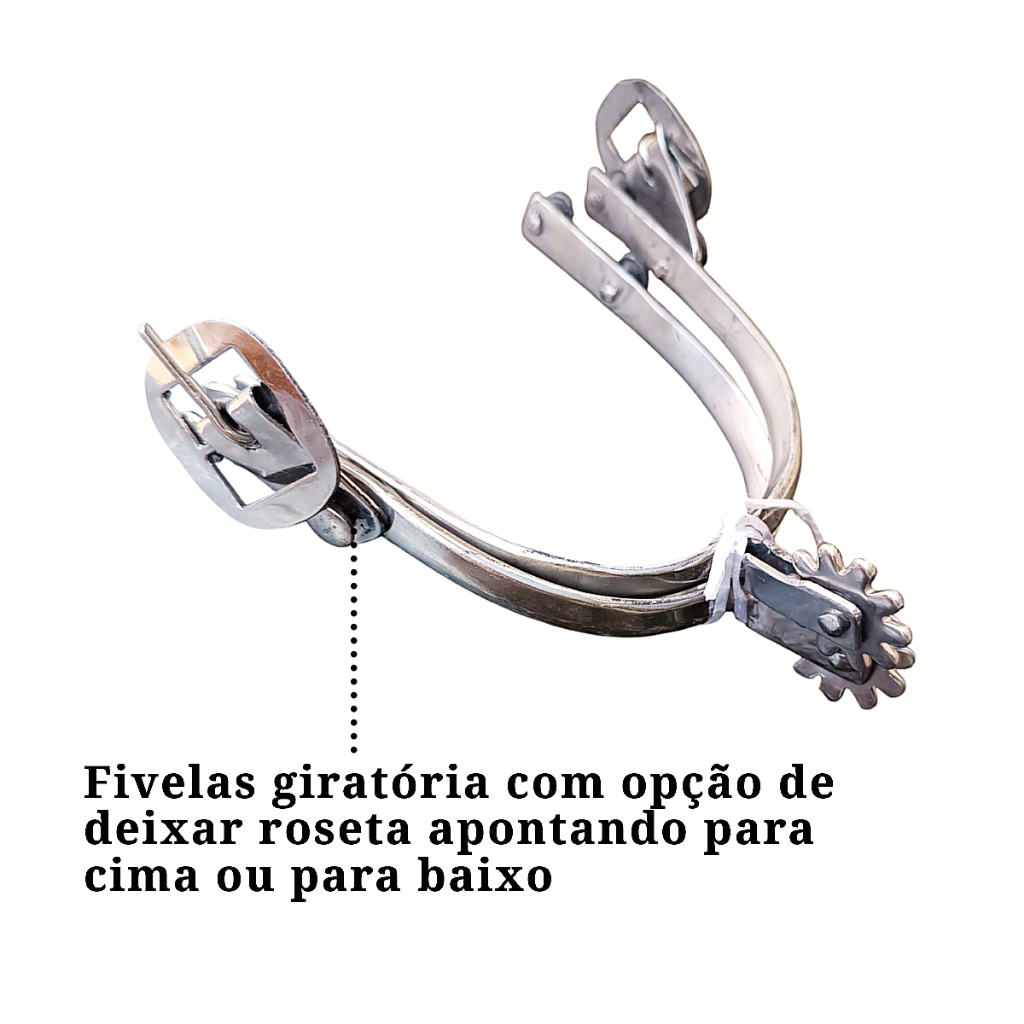 /////Espora Batida Inox – Roseta com ou sem ponta///// A Espora Batida Inox é ideal para quem busca desempenho, durabilidade e um toque tradicional no trato com o animal. Fabricada em aço inox de alta resistência, esta espora combina estilo e funcionalidade, sendo perfeita tanto para o uso no dia a dia quanto em apresentações e provas. - Características principais: //Material: Aço inoxidável polido, resistente à oxidação e de fácil manutenção. //Fivelas giratórias: Exclusivo sistema com fivelas giratórias que permite ajustar a posição da espora, possibilitando o uso com a roseta voltada para cima ou para baixo, conforme a preferência do cavaleiro. //Tipo de roseta: Disponível em duas versões: * Roseta com ponta: Proporciona um estímulo mais firme, ideal para cavalos mais acostumados ou para maior precisão. * Roseta sem ponta: Mais suave, indicada para cavalos sensíveis ou para quem busca um contato mais leve. - Medidas: * Comprimento total da espora: 9 cm * Largura do encaixe do cão/bota: 8 cm * Diâmetro da roseta: 2,5 cm - Benefícios: * Melhor custo - benefício do mercado. * Ajuste anatômico que se adapta bem à bota. * Alta durabilidade, mesmo em ambientes úmidos ou com uso intenso. * Acabamento elegante e tradicional. Seja para o trabalho, esporte ou lazer, a Espora Batida Inox garante estilo, eficiência e cuidado com o animal. ENVIO IMEDIATO PARA TODO O BRASIL !