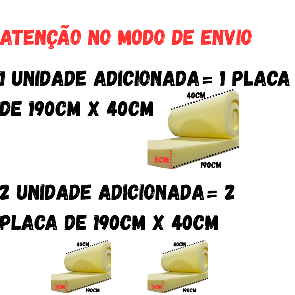 Largura: 1,90m Comprimento: 40cm Composição: Poliuretano Densidade: 33 Espessura:5 cm Toque: Firme Suas vantagens são: ✓ Confortável; ✓ Ótimo Custo Beneficio; ✓ Alta durablidade; ✓ Excelente qualidade; ✓ Fácil aplicação; ✓ Mudança no ambiente sem bagunça; Como é enviada? Cada unidade que você adicionar em seu carrinho é 40cm de comprimento e a largura é fixa em 1,90 metros. Exemplo: 1 unidade= 1 peça de 190cm x 40cm 2 unidade= 2 peça de 190cm x 40cm 3 unidade= 3 peça de 190cm x 40cm