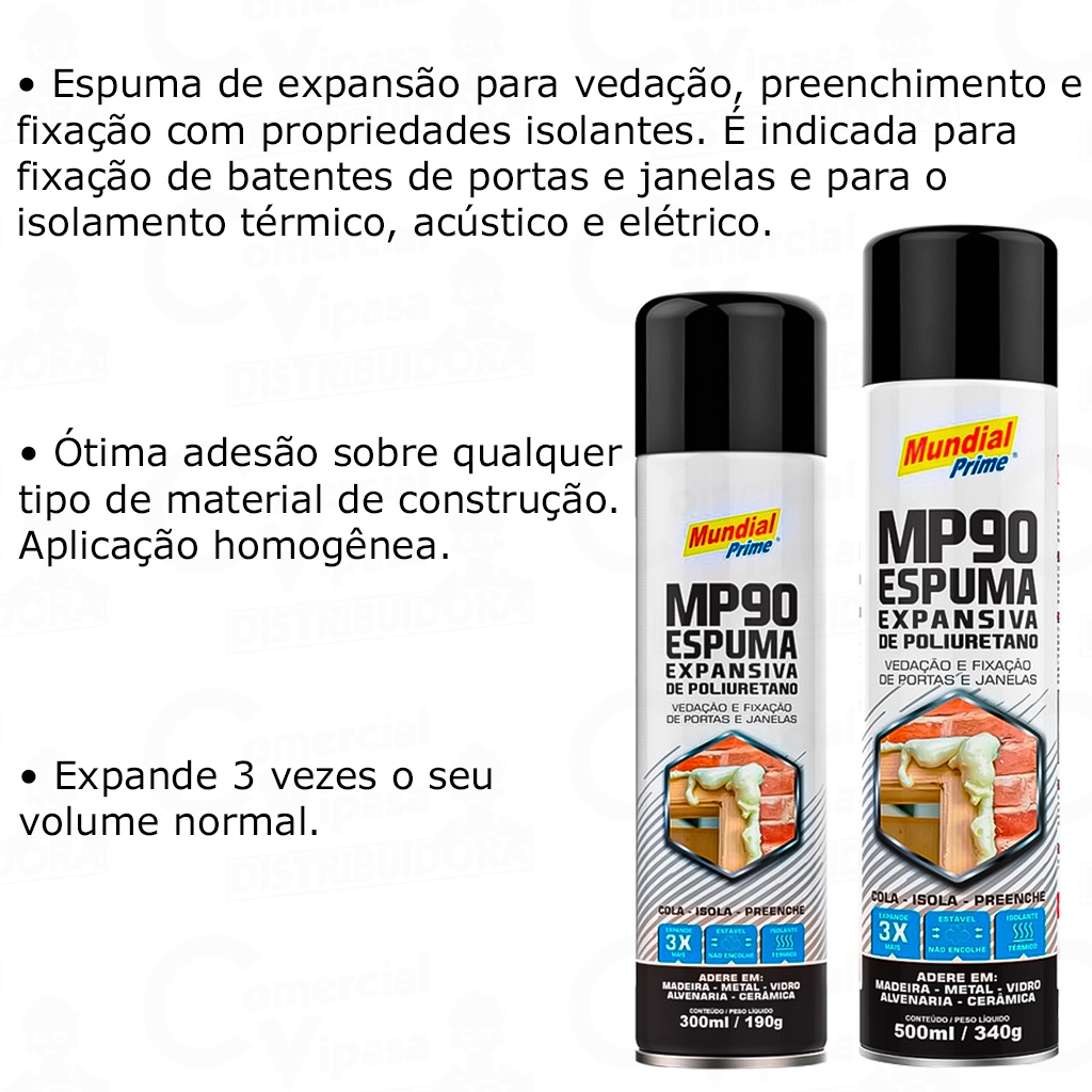 COMERCIAL VIPASA DISTRIBUIDORA. Espuma Expansiva De Poliuretano Pro 300ml - 500ml Vedação Fixação Porta Janela Expandi Fixa Preenche Espuma Expansiva De Poliuretano Pro 300ml 500ml Vedação Fixação Portas Janela Preenche Expandi Fixa Espuma Expansiva Poliuretano vedação fixação para janelas e portas Espuma de expansão para vedação, preenchimento e fixação com propriedades isolantes. É indicada para fixação de batentes de portas e janelas e para o isolamento térmico, acústico e elétrico. Ótima adesão sobre qualquer tipo de material de construção. Aplicação homogênea. Expande 3 vezes o seu volume normal. Instruções de uso Agite bem o tubo antes da aplicação. Rosqueie o bico aplicador e mantenha o tubo de cabeça para baixo durante a aplicação, pressionando a válvula suavemente. As superfícies devem estar limpas e umedecidas. Uma vez endurecida (2 a 5 horas), pode ser cortada ou raspada. Aceita pintura. Caso o conteúdo do tubo não tenha sido totalmente utilizado, recomenda-se limpar a válvula e o bico com acetona antes de guardar. Aplicações Pode ser utilizada no preenchimento de juntas e espaços vazios, montagem de batentes de portas e janelas, fixação de painéis, chapas isolantes e isolantes térmicos e acústicos, acabamento em instalação de aparelhos de ar-condicionado e reparos de trincas. Precauções Armazenar em lugar seco com temperatura entre 0 C e 25 C. Manter fora do alcance de crianças e animais. A espuma expansiva, como a Espuma Expansiva, é um material versátil utilizado em diversas aplicações na construção civil e em projetos de bricolagem. Aqui estão algumas das principais finalidades para as quais a espuma expansiva é comumente usada: Vedação e Isolamento: A espuma expansiva é frequentemente usada para vedar espaços e isolamento térmico. Ela expande ao ser aplicada, preenchendo lacunas e criando uma barreira eficaz contra correntes de ar, umidade e temperatura. Fixação e União: A espuma expansiva pode ser usada para fixar e unir elementos de construção, como janelas e portas em aberturas. Ela adere bem a uma variedade de materiais, proporcionando uma ligação sólida. Preenchimento de Vãos e Fendas: Em projetos de construção, a espuma expansiva pode ser utilizada para preencher vãos, fendas e cavidades. Isso contribui para a estabilidade estrutural e impede a entrada de elementos indesejados, como insetos. Isolamento Acústico: Além do isolamento térmico, a espuma expansiva também pode ter propriedades de isolamento acústico, ajudando a reduzir a transmissão de ruídos. Montagem de Painéis e Elementos Isolantes: Em alguns casos, a espuma expansiva é empregada na montagem de painéis isolantes, proporcionando uma vedação eficaz entre os elementos isolantes e a estrutura. Reparos e Selagem: A espuma expansiva pode ser usada para reparar pequenas fissuras e rachaduras em paredes e superfícies, fornecendo uma solução rápida e eficaz. Modelagem em Projetos Artísticos e Arquitetônicos: Artistas e arquitetos também podem usar a espuma expansiva para criar modelos e estruturas temporárias em projetos artísticos e arquitetônicos. Lembre-se de ler as instruções do fabricante e seguir as orientações de segurança ao usar qualquer produto, incluindo espuma expansiva. O uso adequado garante resultados mais eficazes e seguros. COMERCIAL VIPASA DISTRIBUIDORA.