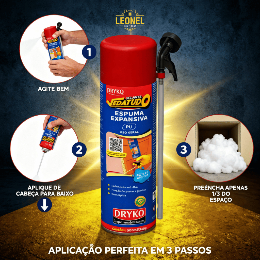 A Espuma Expansiva DRYKO VEDATUDO , um produto monocomponente de poliuretano que cura em contato com a umidade do ar, transformando-se em uma espuma rígida, não tóxica, de cor âmbar. Ideal para fixação, adesão, isolamento térmico e acustico, e preenchimento. CARACTERÍSTICAS PRINCIPAIS: • Fácil aplicação - Basta agitar, aplicar e esperar secar • Secagem rápida - Seca ao toque em aproximadamente 20 minutos • Alta resistência - Durável e resistente após a cura completa • Ótima aderência - Adere perfeitamente a concreto, madeira, PVC, alvenaria, gesso e metais • Expansão impressionante - Expande até 2-3 vezes seu volume original • Isolamento térmico e acústico - Protege contra calor, frio e ruídos • Flexibilidade - Adapta-se aos movimentos da estrutura • Não tóxica após a cura - Segura para uso residencial ⚠️ MODO DE USAR: Agite bem a embalagem antes de usar Aplique sempre de cabeça para baixo para melhor aproveitamento do produto INFORMAÇÕES TÉCNICAS: • Rendimento: 300ml/190g: rende aproximadamente 7 litros de espuma 500ml/340g: rende aproximadamente 11 litros de espuma • Tempo de secagem:Ao toque: 10-20 minutos,Cura completa: 12-24 horas • Resistência à temperatura (após cura): -40°C a +90°C • Validade: 12 meses a partir da data de fabricação