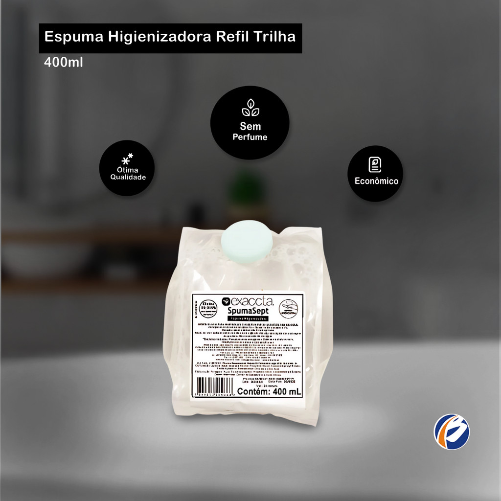 Espuma Higienizadora Refil 400ml Trilha É uma solução prática e eficaz para a higienização das mãos, sua fórmula sem enxágue combina álcool isopropílico e cloreto de benzalcônio, proporcionando ação bactericida e bacteriostática com efeito residual, reduzindo em 99,9% microrganismos. Além de sua eficácia, o produto é dermatologicamente testado, não contém fragrância e é biodegradável, tornando-se uma opção segura e sustentável para uso frequente. Sua formulação suave mantém a pele macia mesmo com aplicações repetidas, e o sistema de refil Eco Fácil facilita o uso e descarte, promovendo a sustentabilidade. Indicação de Uso: - Uso Exclusivo em saboneteiras para refis de espuma de 400ml com válvula; - Ideal para locais com alto fluxo de pessoas, como hospitais, clínicas, restaurantes e escolas. Saboneteiras com Válvula Compatíveis: - 107529 - Mini Saboneteira Espuma com Válvula Branca e Preta Elisa Cód. de Fábrica: EL-MSEBP - 107544 - Saboneteira Espuma Mini com Válvula Branca Exaccta Plus Sustentável Cód. de Fábrica: SU-18SVE - 107529 - Saboneteira Mini Espuma com Válvula Branca Elisa Cód. de Fábrica: EL-MSEBP Eficaz contra: - Salmonella choleraesuis, Pseudomonas aeruginosa, Escherichia coli, Staphylococcus aureus. Fragrância: Sem perfume Embalagem: 01 refil de 400ml