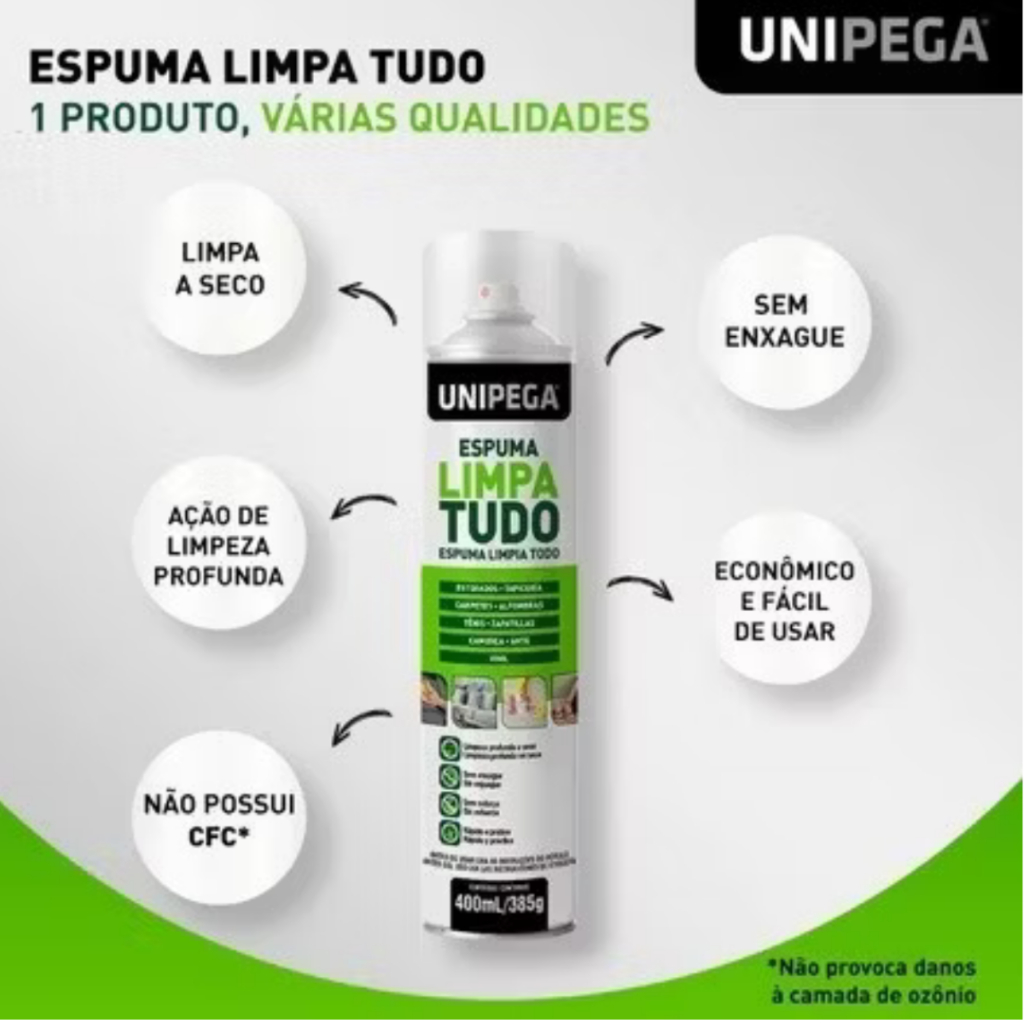Este produto é a Espuma Limpa Tudo da marca Unipega, um limpador multiuso em aerossol projetado para uma higienização prática e rápida sem a necessidade de água. Aqui estão os principais detalhes e benefícios destacados na imagem: Características Principais Limpeza a Seco: Ideal para superfícies que não podem ser encharcadas. Sem Enxágue: Não precisa remover com água após a aplicação, o que economiza tempo. Ação Profunda: Promete remover sujeiras impregnadas de forma eficaz. Eco-friendly: O produto indica que não possui CFC, ou seja, não agride a camada de ozônio. Onde pode ser utilizado? Embora o nome seja "Limpa Tudo", o rótulo sugere aplicações específicas em: Estofados e tapeçaria (sofás, poltronas). Tapetes e carpetes. Tênis e calçados. Interior de veículos (teto, bancos e painéis). Especificações do Produto Volume: 400ml. Peso Líquido: 385g. Formato: Spray aerossol. Dica de uso: Como é um produto de limpeza profunda, recomenda-se sempre testar em uma pequena área escondida do material antes da aplicação total para verificar a fixação das cores.