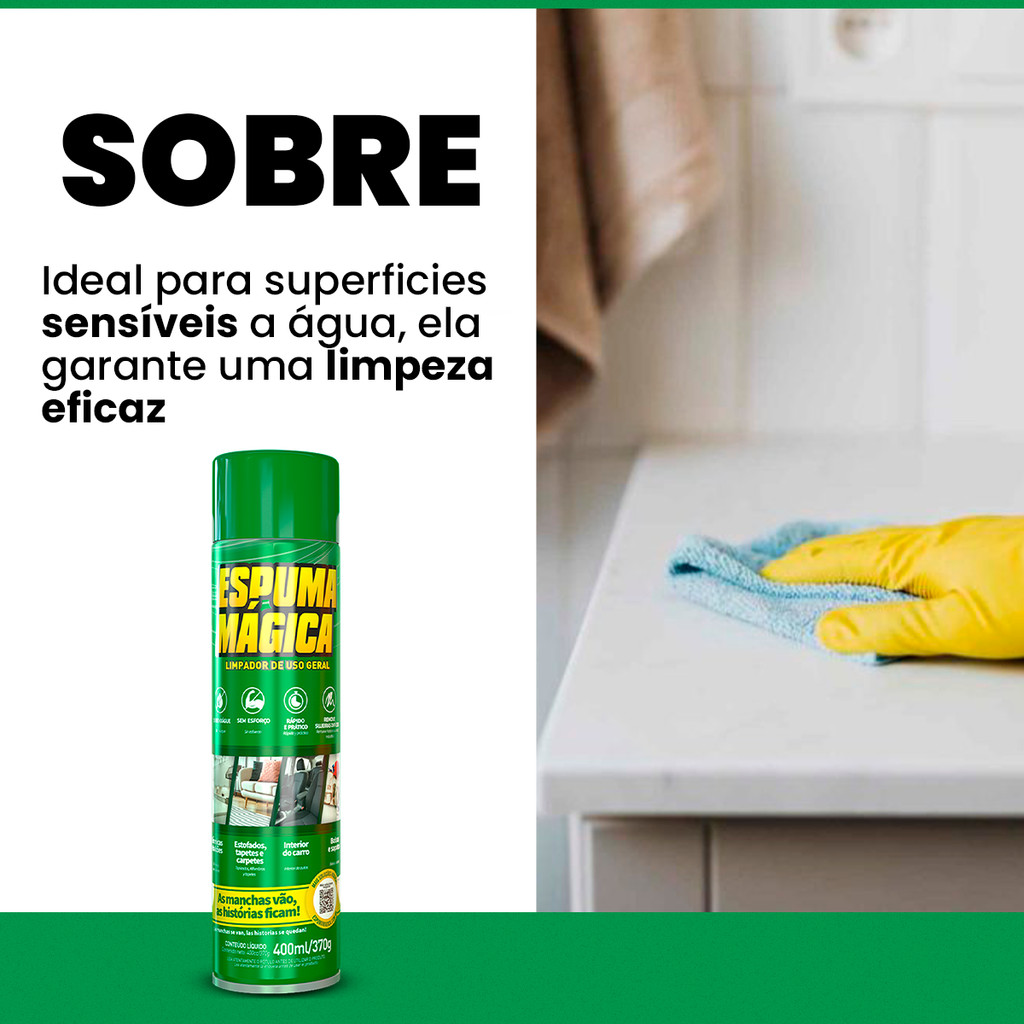 Espuma Mágica Aerosol 400ml Limpador uso Geral Limpeza a Seco A Espuma Mágica é uma limpadora a seco de fácil aplicação e rápida ação. Desenvolvida para limpar todas as superfícies laváveis, especialmente tecidos como sofás, tênis e bancos removendo também as sujeiras mais difíceis como graxa, gordura, resíduos de alimentos e sujeira de tráfego. As manchas vão e as histórias ficam. DADOS DO PRODUTO - Cód. Interno: 011912 - Cód. Fábrica: 2087 - Quantidade: 400ml - Aplicação: Carpetes, estofados, Calçados, Bolsas, Bancos do carro, entre outros. VANTAGENS - Rápido e Prático. - Fórmula exclusiva. - Sem Necessidade de Enxaguar. - Alta Performance Sem Esforço. ITENS INCLUSOS - 1 Espuma Mágica Aerosol 400ml MODO DE USAR 1 - Pulverize um pouco da Espuma Mágica Aerosol 400ml uniformemente. 2 - Deixe agir por alguns poucos segundos. 3 - Remova com pano limpo e seco, preferencialmente de microfibra. OBS: Durante a aplicação, mantenha o frasco na posição vertical a aproximadamente 15 cm da superfície. É indicada a pulverização mínima uniforme (névoa) para melhor eficiência do produto. Não deixar secar sobre as superfícies. Caso aconteça, pulverizar novamente e remover com um pano limpo. IMPORTANTE - Validade 24 Meses. - Valor correspondente a unidade. - Imagens produzidas através de fotos reais do produto. - Leia atentamente as instruções antes de utilizar.