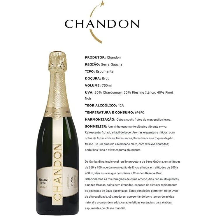 Elaborada a partir do clássico assemblage de três variedades da Serra Gaúcha: Riesling Itálico, Chardonnay e Pinot Noir. Para pequenas ou grandes conquistas que brindam a vida. Do ano que chega às datas comemorativas. Sobre o Espumante Chandon Réserve Brut - Tipo: Brut com 10 g/l de açúcar - Varietal: Riesling Itálico (35%), Pinot Noir, (35%)Chardonnay (30%) - Grad. Álcool.: 11,8% - Paladar: Fresco, equilibrado, média persistência e confirma as notas de frutas cítricas e secas. - Olfato: Frutas cítricas, flores brancas, frutas secas e delicado aroma de pão fresco. - Visão: Amarelo claro com reflexos dourados. - Terroir: Garibaldi - Brasil - Temperatura de Consumo: entre 6º e 9ºC - Harmonização: Ostras frescas, saladas verdes, sushis e sashimis, queijos leves, carne branca e simplesmente evitar doçura, carne vermelha e sabores fortes. Sobre a Chandon ? Grupo LVMH Em 1973 a Chandon do Brasil foi inaugurada em Garibaldi, no Rio Grande do Sul. Hoje, a empresa é líder absoluta no segmento de vinhos espumantes naturais de luxo e além de ter motivos de sobra para celebrar por aqui, a Chandon também é elaborada na Argentina, Califórnia, Austrália, Índia e China. O grupo LVMH ? Louis Vuitton Moët Hennessy - o maior conglomerado de produtos de luxo do mundo, do qual a Chandon faz parte, nasceu em 1987, resultado da união dos grupos franceses Louis Vuitton (fundado em 1854) e Moët Hennessy (procedente do champagne Moët & Chandon, fundado em 1743, e do Cognac Hennessy, de 1765). Com a união, passaram a pertencer a um só grupo os champagnes Dom Pérignon, Krug, Moët & Chandon, Veuve Clicquot, dentre outros nomes fortes do segmento de bebidas de luxo. O Perfeito Terroir Uvas de qualidade são imprescindíveis para um bom vinho espumante natural. Elas só nascem com todo o esplendor em solo e climas favoráveis como em Garibaldi, uma pequena cidade do Sul do país, na qual está localizado o vinhedo, conhecida por suas uvas e pelo alto potencial para a elaboração de vinhos espumantes de qualidade. Por que essa região é boa para a elaboração dos espumantes? O microclima local, temperado e de noites frescas, possibilita a lenta maturação e desenvolvimento de bons níveis de açúcar e de acidez da fruta. Essas são características que, mais tarde, darão origem à fineza aromática e ao frescor do produto. O Vinhedo A uva é a alma do espumante. Por esta razão, a chandon tira o máximo proveito de sua experiência e sua técnica para obter os melhores frutos. Em nossos vinhedos, são cultivadas variedades nobres das cepas chardonnay e pinot noir, mudas importadas da frança, e também o riesling itálico, já cultivado na região, que foi melhorado e incorporado aos assemblages. A Arte Do Assemblage O assemblage tem como significado a harmonização de diversos vinhos de uma mesma região, geralmente de diferentes safras e variedades de uvas. Aqui temos um dos segredos da chandon: o desafio de reunir o melhor de cada amostra e obter um conjunto de qualidade superior a dos vinhos individualmente. Sendo assim, o assemblage nada mais é que uma combinação de ciência e arte e não apenas de técnica.