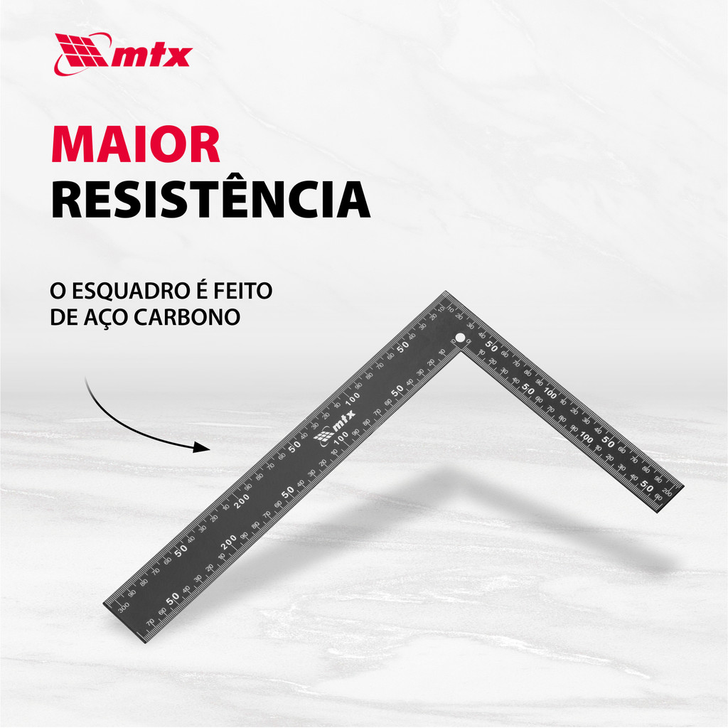Esquadro de Metal MTX 323709: Precisão e Durabilidade para Carpintaria e Acabamento O Esquadro de Metal MTX 323709, com suas dimensões de 200 x 300 mm, é a ferramenta ideal para verificar ângulos retos e marcar linhas com precisão, essencial para trabalhos de carpintaria e acabamento de alta qualidade. Este esquadro foi cuidadosamente projetado para atender às necessidades de profissionais que buscam precisão e confiabilidade em seus projetos. Vantagens: Alta Resistência: Fabricado em aço carbono laminado a quente, o Esquadro de Metal MTX 323709 se destaca pela sua durabilidade excepcional. O uso deste material de alta qualidade assegura que a ferramenta possa suportar o uso intenso em ambientes de trabalho exigentes, mantendo sua integridade e precisão ao longo do tempo. Facilidade de Uso: A marcação é aplicada em ambos os lados do esquadro, facilitando a leitura e o uso em diversas situações. Essa característica torna o esquadro extremamente versátil e conveniente, permitindo que os usuários realizem marcações precisas e verifiquem ângulos com facilidade, independentemente da direção de uso. Possibilidade de Armazenamento Suspenso: O design inteligente inclui um furo no estojo, permitindo que o esquadro seja armazenado de maneira prática, pendurado em um gancho. Isso não só economiza espaço na área de trabalho, mas também garante que a ferramenta esteja sempre acessível e pronta para uso. Essencial para Trabalhos de Precisão: O Esquadro de Metal MTX 323709 é uma ferramenta indispensável para profissionais de carpintaria e acabamento que valorizam a precisão e a eficiência. Sua construção robusta e características bem pensadas garantem que você possa realizar seu trabalho com a máxima precisão, contribuindo para resultados finais de alta qualidade. Seja para verificar ângulos, marcar linhas de corte ou simplesmente garantir a precisão em seus projetos, este esquadro é a escolha certa para elevar o nível do seu trabalho.