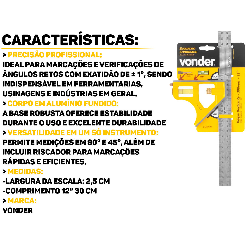 Esquadro Combinado 12" Vonder O Esquadro Combinado Vonder é a ferramenta ideal para quem busca precisão em marcações de ângulos retos. Fabricado com materiais de alta qualidade, possui corpo em alumínio fundido e régua em aço inox, garantindo resistência ao desgaste e corrosão. Proporciona um trabalho mais eficiente e seguro, sendo uma ferramenta indispensável para quem busca qualidade e alto padrão de acabamento. Características: > Acompanha riscador; > Permite medir ângulos de 45° e 90°; > Números da escala gravados em baixo relevo, facilitando a leitura e conferindo maior vida útil; > Possui corpo/base em alumínio fundido e régua deslizante em aço inox, proporcionando maior resistência. Especificações Técnicas: > Capacidade: 300mm; > Largura da escala: 25mm; > Material da escala: aço inoxidável; > Material do corpo do esquadro: alumínio fundido. - Marca: Vonder - Garantia: 90 dias contra defeitos de fabricação Vantagens de comprar na Brester: - Produto a pronta entrega. - Produto novo, com garantia de fábrica. - Nota fiscal para Pessoa Física e Pessoa Jurídica.