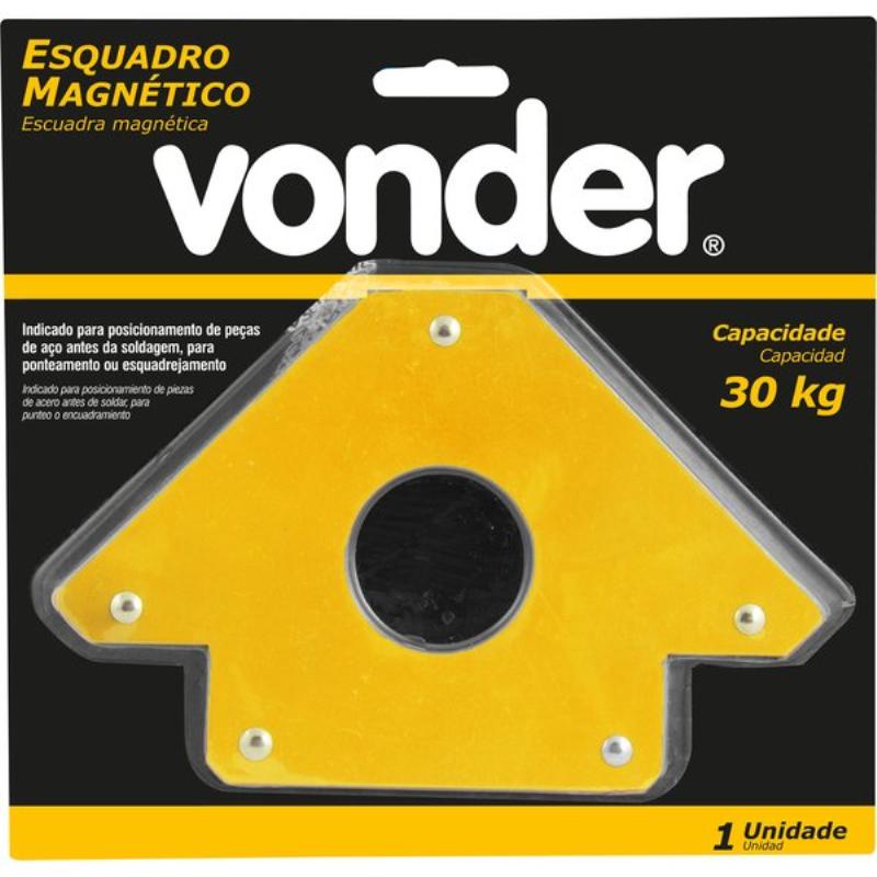 Esquadro magnético para soldador, 30 kg, VONDER 35.99.030.000 <b>Conteúdo da Embalagem:</b> 1 Esquadro magnético Indicado para posicionamento de peças de aço antes da soldagem, para ponteamento ou esquadrejamento. Oferece precisão em ângulos de 135, 90 e 45, segurando a peça e permitindo ao operador pontear com precisão e segurança. <b>CARACTERÍSTICAS:</b> Capacidade:30 kg Medida (A):190 mm Medida (B):122 mm Medida (C):113 mm Medida (D):112 mm Medida (E):33 mm Espessura:25 mm Peso aproximado:1,08 kg