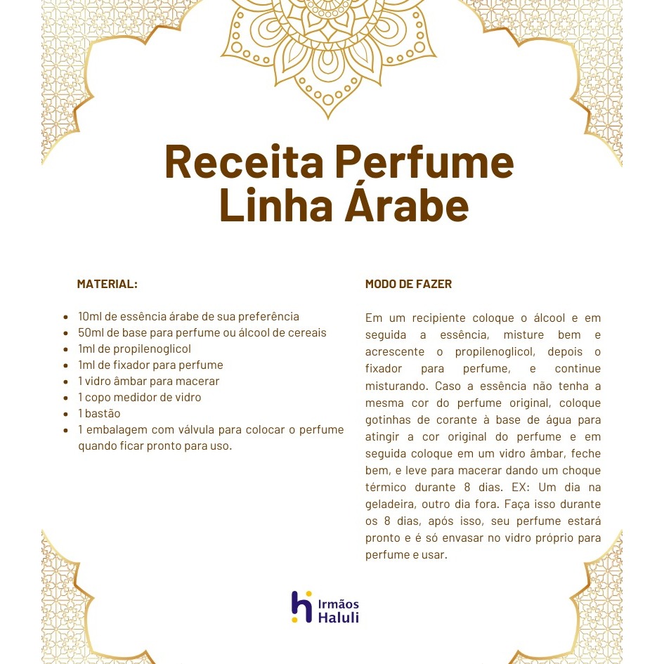 Essência LAT - Fakhar Extra P/ Perfumes Linha Árabe Irmãos Haluli. Inspirada no perfume original Lattafa Fakhar Extrait Gold Já pensou em produzir um perfume com sua essência favorita? Aqui na Irmãos Haluli você encontra as essências da linha árabe que são exclusivas para perfumaria fina. Um Perfume Árabe é uma fragrância única e envolvente que reflete a rica cultura e tradição da região do Oriente Médio. Essas fragrâncias são conhecidas por suas notas exóticas e opulentas, que combinam especiarias picantes, flores exuberantes e madeiras preciosas. Descrição do produto: As essências da Linha Irmãos Haluli são fabricadas por fornecedores de qualidade, possuem alto poder de fixação e todas passam por um rígido controle de qualidade quando envasadas. Indicação de uso em: Perfume; Lavanda; Colônia; Água de cheiro; Exclusivo para uso na pele. Atenção: Para qualquer utilização diferente das citadas acima, esta essência deverá ser testada para evitar traços de turbidez. Composição: Mistura de substâncias odoríferas líquidas de origem natural ou sintética. Embalagem: Frasco âmbar 10ml