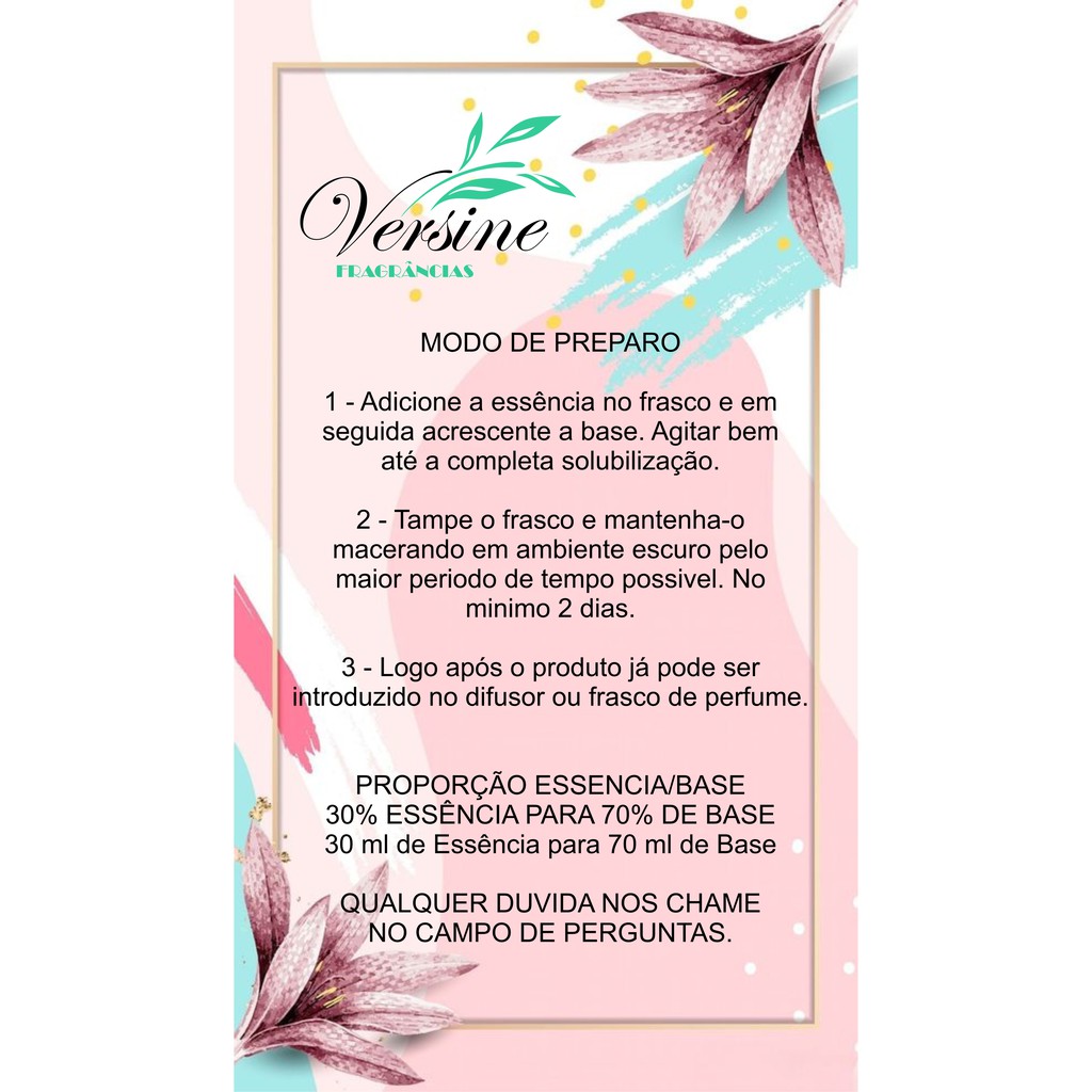Você Receberá 1 Frasco de Essência Mel 100 ml a sua escolha Validade: 24 meses Embalagem: Pet âmbar e tampa lacre Envio imediato _______________________________ A Versine Fragrâncias surgiu com o intuito de oferecer um conceito inovador para os seus clientes, oferecendo o que a de melhor e assegurando uma qualidade inigualável. Faça seu próprio aromatizador, com a concentração que deseja, nossas essências são concentradas, ideais para fazer: sabonetes, aromatizadores de ambiente, difusores elétricos, difusores de varetas, velas aromáticas, lembrancinhas e muito mais. Nossas essências são fabricadas com insumos importados com o que há de melhor no mercado, garantido alta qualidade e fixação do produto. ______________________________ CUIDADOS E PRECAUÇÕES: Manter fora do alcance de crianças e animais domésticos. Não ingerir, não usar puro sobre a pele. Em caso de contato com os olhos, lave com água em abundância. Em caso de irritação ou ingestão, suspender o uso e procure um medico. Manter em local fresco e arejado. _________________________________ Modo de Preparo 1º Coloque a base no frasco e depois acrescente a essência, misture bem para a essência se diluir na base. 2º Tampe o frasco e deixe no mínimo dois dias dentro de um ambiente escuro. (Quanto mais tempo o perfume ficar macerando no escuro, melhor o perfume). 3º Retire o frasco do ambiente escuro e coloque o perfume dentro do difusor e introduza as varetas condutoras no frasco para que absorva o perfume (aromatizante). Proporção indicada: Moderado 100 ml de Essência para 900 ml de Base. Intenso: 200 ml de Essência para 800 ml de Base. Muito Intenso: 300 ml de Essência para 700 ml de Base. __________________________________ Duvidas Frequentes: - A essência é a base de óleo? Sim, são a base de óleo. -Serve em difusor elétrico? Sim, somente a essência pura sem a diluição na base. -Tem a Pronta entrega? Sim, temos todas as opções a pronta entrega. -Pode ser aplicado direto na pele? Não indicamos, para melhor efeito do produto indicamos a diluição da essência na base pronta.