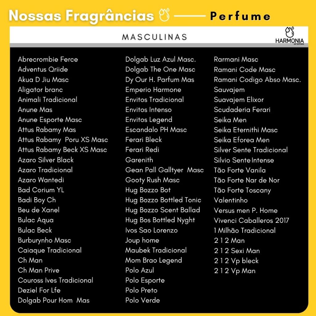 Essências de Perfume 100ml – Harmonia Aromas Transforme suas ideias em fragrâncias exclusivas! As Essências de Perfume Harmonia Aromas 100ml são a escolha certa para quem deseja criar perfumes, colônias e desodorantes de alta qualidade. Com matéria-prima importada e embalagem pet âmbar com tampa lacre, você garante proteção, praticidade e profissionalismo na sua produção. Nossas essências são multiuso: ideais para perfumes, sabonetes, sachês, aromatizadores de ambiente (varetas ou spray), aromatizantes de tecidos ou até difusores elétricos. E se você está começando, não se preocupe: nós te acompanhamos com um manual gratuito, cheio de receitas, dicas e respostas às dúvidas mais comuns dos nossos clientes. Imagine oferecer ao seu cliente uma fragrância marcante, envolvente e duradoura, criada por você. Com nossas essências: ✅ Qualidade Premium: matérias-primas importadas e seguras. ✅ Versatilidade: aplicações diversas no mundo da perfumaria artesanal. ✅ Suporte total: atendimento ágil e suporte 7 dias por semana. ✅ Entrega expressa: pedidos feitos até às 15h são enviados no mesmo dia. Assim, você ganha confiança, agilidade e diferenciação para o seu negócio. 👉 Escolha já sua fragrância preferida no campo de seleção. ⚠️ Caso não selecione, enviaremos as fragrâncias mais vendidas da HARMONIA aromas para não atrasar seu envio. 💌 Após sua compra, solicite gratuitamente o nosso manual de produção e dê o primeiro passo para criar perfumes e aromatizadores de sucesso!