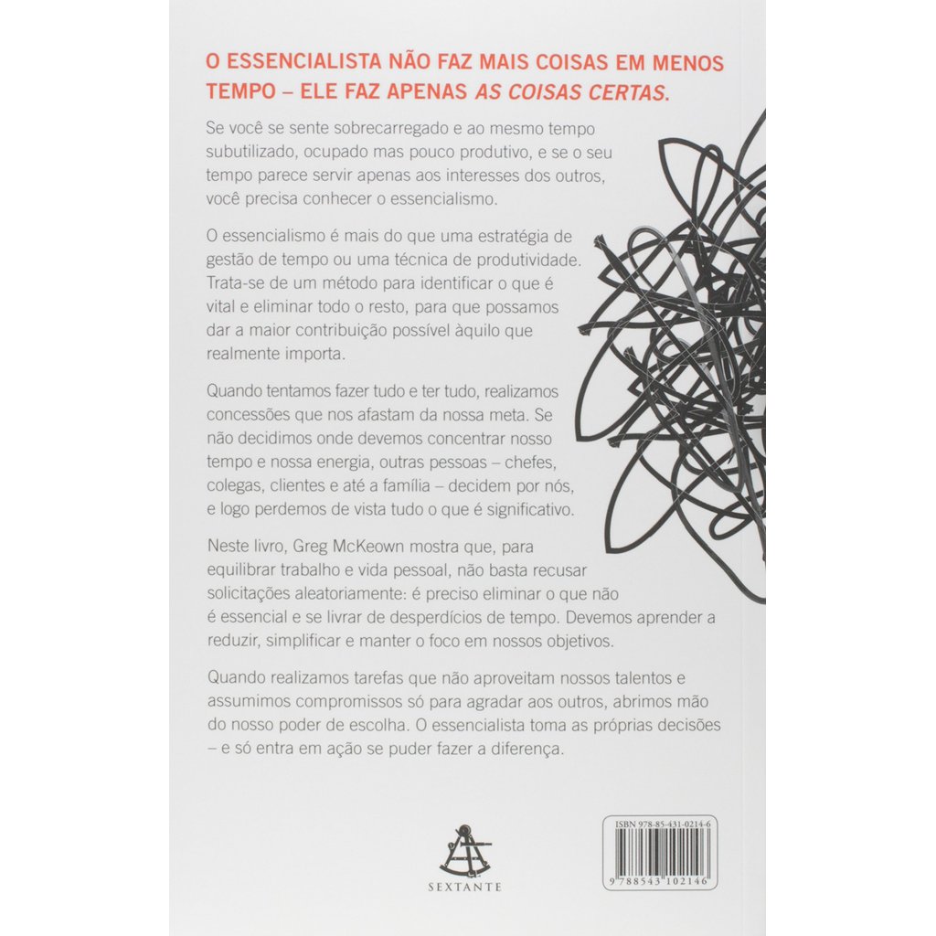 Se você se sente sobrecarregado e ao mesmo tempo subutilizado, ocupado, mas pouco produtivo, e se o seu tempo parece servir apenas aos interesses dos outros, você precisa conhecer o essencialismo. O essencialismo é mais do que uma estratégia de gestão de tempo ou uma técnica de produtividade. Trata-se de um método para identificar o que é vital e eliminar todo o resto, para que possamos dar a maior contribuição possível àquilo que realmente importa. Quando tentamos fazer tudo e ter tudo, realizamos concessões que nos afastam da nossa meta. Se não decidimos onde devemos concentrar nosso tempo e nossa energia, outras pessoas – chefes, colegas, clientes e até a família – decidem por nós, e logo perdemos de vista tudo o que é significativo. Neste livro, Greg McKeown mostra que, para equilibrar trabalho e vida pessoal, não basta recusar solicitações aleatoriamente: é preciso eliminar o que não é essencial e se livrar de desperdícios de tempo. Devemos aprender a reduzir, simplificar e manter o foco em nossos objetivos. Quando realizamos tarefas que não aproveitam nossos talentos e assumimos compromissos só para agradar aos outros, abrimos mão do nosso poder de escolha. O essencialista toma as próprias decisões – e só entra em ação se puder fazer a diferença. "Greg McKeown nos lembra que a clareza de foco e a capacidade de dizer 'não' são aspectos desvalorizados, porém fundamentais para os negócios nos dias de hoje." – Jeff Weiner, presidente-executivo do LinkedIn.