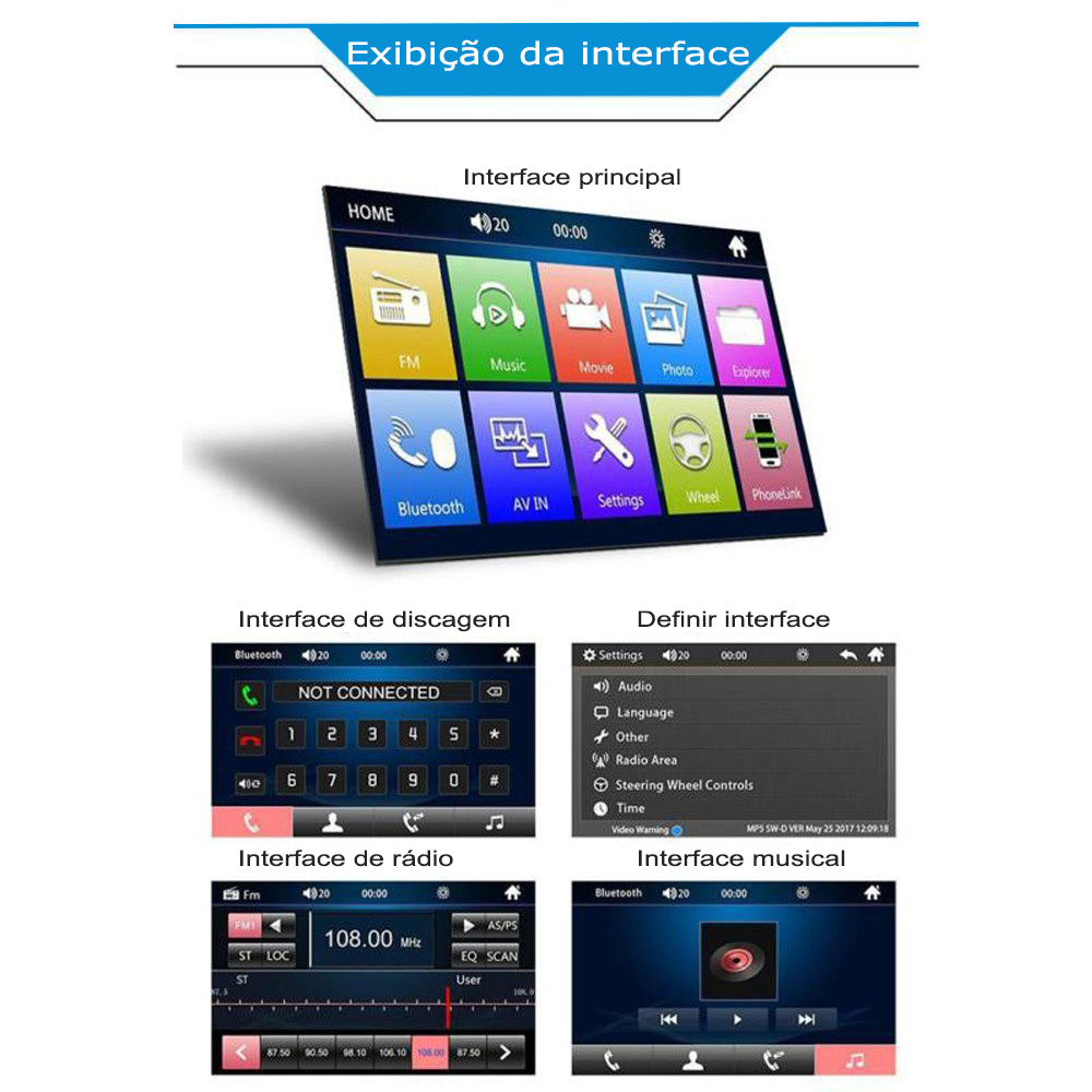Descrição: 【Rádio automotivo universal 1 Din/2 Din com tela sensível ao toque de 7 polegadas】 O som automotivo com tela sensível ao toque de 7 polegadas suporta conexão com celulares iOS para espelhamento. Você pode acessar endereços, agendas, e-mails, notificações, navegação por mapa, músicas, vídeos e outras informações, além de realizar comandos de voz. A tela sensível ao toque capacitiva de 7 polegadas é adequada para aberturas de painel duplas e simples. 【Rádio Bluetooth/FM/swc】 Rádio din único com Bluetooth para atender e fazer chamadas no modo viva-voz, reproduzindo música de forma inteligente. Os receptores de áudio do carro suportam rádio FM, com 18 estações predefinidas, você pode ouvir informações de trânsito em tempo real, noticiários, previsões do tempo, etc. Suporte para controle no volante, alterne rapidamente as funções desejadas com o volante do seu carro, mais conveniente. 【Android/IOS Mirror Link】 Suporte para rádio Mirror Link 1 DIN, pode ser sincronizado com a tela do carro através do cabo USB original do celular. 【Entrada para câmera de ré】 Unidade principal 1 DIN com câmera de ré, câmera de 12 LEDs com lente grande angular de 170° e proteção IP68 contra água, com suporte para exibição automática de imagens. Ao engatar a marcha ré, a tela do rádio do carro exibirá automaticamente a imagem de ré e gravará o tráfego, tornando sua marcha ré diária mais segura e conveniente. 【Multimídia e multifuncional】 A resolução de 1080 é nítida e brilhante, permitindo assistir a filmes em HD. Equipado com função de entrada AUX/EQ/USB/TF, suporta MP4/MP5/WMA e outros formatos de reprodução de áudio, além de RMVB/RM/VOB/MOV/AVI e outros formatos de reprodução de vídeo. Tipo: MP5 para carro - Sistema: Sistema Win-ce - CPU: C200s - Memória de execução: 256 MB - Memória de armazenamento: Nenhuma - Resolução da tela: 1080P - Tamanho da tela: 7 polegadas de alta definição (IPS) - Frequência de áudio: FM 87,5 ~ 108,0 MHz - Potência de saída: 60W x 4 - Tensão de operação: 12 ~ 14,4 V - Temperatura de operação: -10 ~ 60 ℃ - Versão do Bluetooth: versão 5.0 - Wi-Fi: Não suportado - Suporte para reprodução de vídeo - Suporte para saída de vídeo - Mapa offline não suportado - O gravador de direção não suporta - USB frontal USB 2.0 - Formato de áudio MP3/WMA/WAV/APE/FLAC - Formato de vídeo RM/RMVB/AVI/MP4/MKV/3GP - Jpg Formato de imagem BMP PNG Características: 1. Rádio FM 2. Leitor de cartão U-Disk (áudio/vídeo/imagem) 3. Função Aux 4. Função Bluetooth 5. Saída de áudio RCA com possibilidade de conexão ao subwoofer 6. Função de visão traseira 7. Entrada de vídeo 8. Controles no volante 9. Mirror Link 10. Luzes coloridas 11. Celular 9. Mirror Link 10. Luzes coloridas 11. Função de carregamento de celular Pacote: 1 * Leitor MP5 1 * Manual do usuário 2 * Cabo de alimentação 1 * Controle remoto 1 * Câmera traseira com 12 LEDs (opcional)