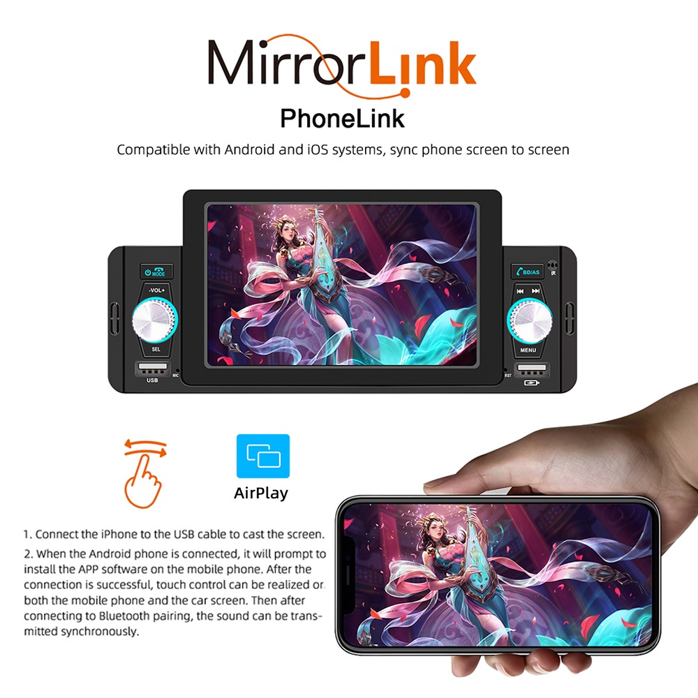Por que escolher este reprodutor? 【Vídeo HD de 5 polegadas】Este reprodutor MP5 para carro pode reproduzir vídeos armazenados no disco USB com antecedência. A resolução de 800x480p e o amplificador de potência de 60W*4 permitem que você desfrute de um banquete audiovisual no carro com a tela grande de 5 polegadas. Reprodução de vídeo: suporta formatos de reprodução de vídeo como rm/rmvb/avi/mp4/mkv/3gp. 【MirrorLink】O MirrorLink permite que os usuários controlem o celular por meio da seleção de botões ou operação por voz, permitindo fazer e receber chamadas, reproduzir vídeos, navegar por GPS e usar aplicativos via USB. A tela do smartphone pode ser totalmente mapeada para o equipamento do veículo, permitindo o controle bidirecional do celular e do sistema de entretenimento. A conexão entre o carro e o celular pode ser feita por meio de um cabo de dados USB. 【Entrada para Câmera de Ré】Se conectado a uma câmera de ré do carro, quando o carro estiver em marcha ré, o monitor do som automotivo exibirá automaticamente os detalhes da marcha ré. (Câmera opcional) 【Duas portas USB】Suporta carregamento rápido (porta USB individual para carregar celulares Android e iOS) e USB para ler dados, como vídeos ou músicas. 【Equalizador de música sem perdas】O rádio do carro suporta MP3/WMA/WAV/APE/FLAC e outros formatos de música, além de efeitos sonoros Pop/Rock/Clássico/Flat Four. 【Bluetooth 5.0 Mãos-Livres Mais Recente】Após a conexão Bluetooth, as chamadas de celular podem ser feitas em modo mãos-livres, além de suportar música via Bluetooth e outras transmissões. 【Rádio FM】18 estações predefinidas, FM1/FM2/FM3 com três efeitos de rádio de alta qualidade. Suporta saída de áudio RCA e pode ser conectado a um subwoofer. Tipo: MP5 automotivo -Sistema: Sistema WIN-CE -Resolução da tela: 480x800 -Tamanho da tela: 5 polegadas de alta definição (IPS) -Frequência de áudio: FM 87,5~108,0MHz -Tensão de operação: 12~14,4V -Temperatura de operação: -10~60°C -Suporte para reprodução de avisos de vídeo -Suporte para saída de vídeo -Mapa offline não suportado -Gravador de direção não suportado -USB 2.0 frontal -Formato de áudio MP3/WMA/WAV/APE/FLAC -Formato de vídeo RM/RMVB/AVI/MP4/MKV/3GP -Formato de imagem JPG BMP PNG Recursos: 1. Rádio FM 2. Leitor de cartão U disk (áudio/vídeo/imagem) 3. Função AUX 4. Função de visão traseira 5. Entrada de vídeo 6. Controles no volante 7. Luzes coloridas 8. Carregamento de celular Função Pacote: 1*MP5 Player 1*Manual do usuário 2*Cabo de alimentação 1*Controle remoto