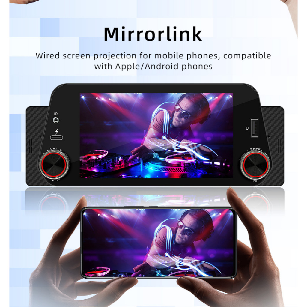 Características: 【Vídeo HD de 5 polegadas】Este MP5 Car Player pode reproduzir o vídeo que você armazenou no disco USB com antecedência. A resolução de 1080*480P e o amplificador de potência de 60W*4 permitem que você aproveite um banquete audiovisual no carro com a tela grande de 5 polegadas. Reprodução de vídeo: suporta formatos de reprodução de vídeo como rm/rmvb/avi/mp4/mkv/3gp 【CarPlay e Android Auto】 O Apple CarPlay e o Android Auto integrados integram perfeitamente seu iPhone com a tela LCD de toque capacitiva de 7 polegadas da unidade principal e os controles via conexão USB. Agora você pode fazer chamadas telefônicas, acessar sua música, enviar e receber mensagens, obter direções e muito mais enquanto se concentra na estrada. Você também pode acordar o assistente de voz superior Siri para tornar a operação ainda mais fácil. 【Mirror Link】A tela do smartphone pode ser completamente mapeada para o equipamento do veículo, e o controle bidirecional do telefone celular e do sistema de entretenimento pode ser realizado. Para que o player do carro consiga fazer e receber chamadas, reprodução de vídeo, navegação GPS e aplicativos. 【Entrada da câmera de visão traseira】Se conectado a uma câmera de ré do carro, quando o carro estiver em marcha ré, o monitor estéreo do carro mudará para detalhes de marcha ré automaticamente. (Câmera opcional) 【Rádio FM】18 estações podem ser predefinidas, FM1/FM2/FM3 três efeitos de rádio de alta qualidade. Suporta saída de áudio RCA, pode ser conectado a um subwoofer. 【Porta USB dupla e porta tipo C】O áudio do carro suporta carregamento rápido (porta USB individual para carregamento de telefone para Android e iOS) e USB para ler dados, como vídeo ou música. 【Equalizador de som de música sem perdas】O rádio do carro suporta MP3/WMA/WAV/APE/FLAC e outros formatos de música, suporta Pop/Rock/Clássico/Flat quatro efeitos sonoros. 【Bluetooth mãos-livres】Após a conexão Bluetooth, as chamadas de celular podem ser operadas com as mãos livres, além de suportar música Bluetooth e outras transmissões. Tipo: MP5 para carro -Sistema: Sistema WIN-CE -CPU: C200S -Memória de execução: 256M -Memória de armazenamento: Nenhuma -Resolução da tela: 480x800 -Tamanho da tela: 5 polegadas de alta definição (IPS) -Frequência de áudio: FM 87,5~108,0MHz -Potência de saída: 60Wx4 -Tensão de trabalho: 12~14,4V -Temperatura de trabalho: -10~60℃ -Versão Bluetooth: versão 5.0 (nome padrão: Car-BT) -Wifi: não suportado -Suporte para aviso de reprodução de vídeo -Suporte para saída de vídeo -Mapa offline não suportado -Gravador de direção não suportado -USB USB2.0 frontal -Formato de áudio MP3/WMA/WAV/APE/FLAC -Formato de vídeo RM/RMVB/AVI/MP4/MKV/3GP -Formato de imagem JPG BMP PNG Características: 1. Rádio FM 2. Leitor de cartão U disk (áudio/vídeo/imagem) 3. Porta Typr-C 4. Função Bluetooth 5. Saída de áudio RCA pode ser conectada ao subwoofer 6. Função de visão traseira 7. Entrada de vídeo 8. Controles do volante 9. Link do espelho 10. Luzes coloridas 11. Função de carregamento de celular (interface USB, interface TIPO-C 2.1A de carregamento)" Pacote: 1*MP5 Player 1*Manual do usuário 2*Cabo de alimentação 1*Controle remoto