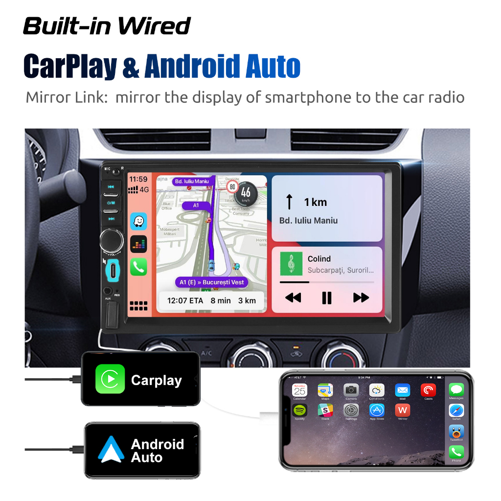 Descrição: 【Rádio automotivo universal 2 Din com tela sensível ao toque de 7 polegadas】 O som automotivo com tela sensível ao toque de 7 polegadas suporta conexão com celulares iOS para espelhamento. Você pode acessar endereços, agendas, e-mails, notificações, navegação por mapa, músicas, vídeos e outras informações, além de realizar comandos de voz. A tela sensível ao toque capacitiva de 7 polegadas é adequada para aberturas de painel duplas e simples. 【Rádio Bluetooth/FM/swc】 Rádio din único com Bluetooth para atender e fazer chamadas no modo viva-voz, reproduzindo música de forma inteligente. Os receptores de áudio do carro suportam rádio FM, com 18 estações predefinidas, você pode ouvir informações de trânsito em tempo real, noticiários, previsões do tempo, etc. Suporte para controle no volante, alterne rapidamente as funções desejadas com o volante do seu carro, mais conveniente. 【Automóvel de carros CarPlay&Android】 Recurso Apple CarPlay e Android Auto integram perfeitamente seu iphone com o display LCD de toque capacitivo de 7 polegadas da unidade de cabeça e controles via conexão USB. Agora você pode fazer chamadas telefônicas, acessar suas músicas, enviar e receber mensagens, obter direções e mais enquanto estiver focado na estrada. Você também é capaz de acordar o assistente de voz superior siri para facilitar a operação. 【Android/IOS Mirror Link】 Suporte para rádio Mirror Link 1 DIN, pode ser sincronizado com a tela do carro através do cabo USB original do celular. 【Entrada para câmera de ré】 Unidade principal 2 DIN com câmera de ré, câmera de 12 LEDs com lente grande angular de 170° e proteção IP68 contra água, com suporte para exibição automática de imagens. Ao engatar a marcha ré, a tela do rádio do carro exibirá automaticamente a imagem de ré e gravará o tráfego, tornando sua marcha ré diária mais segura e conveniente. 【Multimídia e multifuncional】 A resolução de 1080 é nítida e brilhante, permitindo assistir a filmes em HD. Equipado com função de entrada AUX/EQ/USB/TF, suporta MP4/MP5/WMA e outros formatos de reprodução de áudio, além de RMVB/RM/VOB/MOV/AVI e outros formatos de reprodução de vídeo. Tipo: MP5 para carro - Sistema: Sistema Win-ce - CPU: C200s - Memória de execução: 256 MB - Memória de armazenamento: Nenhuma - Resolução da tela: 1080P - Tamanho da tela: 7 polegadas de alta definição (IPS) - Frequência de áudio: FM 87,5 ~ 108,0 MHz - Potência de saída: 60W x 4 - Tensão de operação: 12 ~ 14,4 V - Temperatura de operação: -10 ~ 60 ℃ - Versão do Bluetooth: versão 5.0 - Wi-Fi: Não suportado - Suporte para reprodução de vídeo - Suporte para saída de vídeo - Mapa offline não suportado - O gravador de direção não suporta - USB frontal USB 2.0 - Formato de áudio MP3/WMA/WAV/APE/FLAC - Formato de vídeo RM/RMVB/AVI/MP4/MKV/3GP - Jpg Formato de imagem BMP PNG Características: 1. Rádio FM 2. Leitor de cartão U-Disk (áudio/vídeo/imagem) 3. Função Aux 4. Função Bluetooth 5. Saída de áudio RCA com possibilidade de conexão ao subwoofer 6. Função de visão traseira 7. Entrada de vídeo 8. Controles no volante 9. Mirror Link 10. Luzes coloridas 11. Celular 9. Mirror Link 10. Luzes coloridas 11. Função de carregamento de celular Pacote: 1 * Leitor MP5 1 * Manual do usuário 2 * Cabo de alimentação 1 * Controle remoto 1 * Câmera traseira com 12 LEDs (opcional)