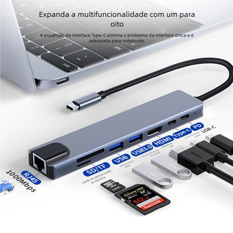 Estação de Acoplamento Tipo C 8 em 1 - Transferência Rápida para HD e Cartão SD 💻 Estação de Acoplamento 8 em 1: Conectividade Completa para Seu Dia a Dia!Projetada para maximizar a performance do seu dispositivo Tipo C, esta estação de acoplamento oferece vídeo, transferência de dados, leitura de cartões e rede em um único produto. ✅ Características Principais HDMI com Qualidade de Cinema: Suporta 4K@30Hz ou 1080p@60Hz e PD 87W, ideal para conectar seu notebook ou celular a projetores ou monitores para assistir filmes, jogar ou fazer apresentações. Transferência de Dados Super Rápida: Portas USB com velocidade de 5Gbps, transferindo arquivos HD em segundos. A porta USB 2.0 garante estabilidade para mouse, teclado e outros acessórios USB. Leitor de Cartão SD Eficiente: Acesso a cartões SD e Micro SD com velocidade de 100MB/S — perfeito para criadores de conteúdo acessarem fotos e vídeos rapidamente. Observação: apenas um cartão pode ser usado por vez. Ethernet RJ45 para Conexão Fixa: Velocidade de 10/100 Mbps, mais rápida e estável que o Wi-Fi, ideal para trabalhos que exigem conexão constante. ⚠️ Aviso Importante Verifique a compatibilidade do seu dispositivo com Tipo C e OTG antes de comprar.