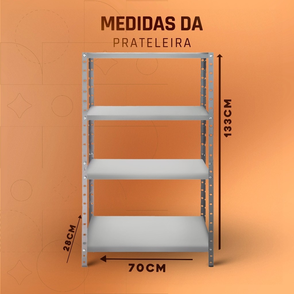 Estante 4 prateleiras multiuso resistente, feita de aco e com excelente custo-beneficio! ' ATENCAO: o produto vai desmontado para baratear o frete. Montagem por conta do comprador' Prateleiras perfeitas para armazenar livros, pastas, documentos em geral e ate para incrementar a decoracao de sua casa com enfeites variados Acompanha porcas e parafusos, tornando a montagem ainda mais rapida e pratica Ideal tanto para ambientes domesticos (quarto, cozinha, sala, banheiro etc.) quanto para espacos profissionais, como escolas, escritorios, reparticoes, lojas de roupas, armazens e muito mais! Pintura industrial resistente a oxidacao Acabamento moderno Acompanha protecao nos pezinhos para manter seu chao sem riscos Estrutura reforcada: a prateleira nao enverga! AGUENTA MUITO PESO (de 20kg a 30kg por andar/bandeja, dependendo do modelo escolhido): Brinquedos Roupas Livros Ferramentas Materiais diversos TAMANHO DA ESTANTE 4 PRATELEIRAS MONTADA - Altura: 134 cm - Largura: 70 cm - Profundidade: 28 cm Conteudo da Embalagem: - 04 Prateleira (bandeja) - 08 Colunas - 01 jogo de parafusos + Sapatinhas Importante: Garantia de 3 Meses Valor do kit. Imagens Meramente Ilustrativas. Recomendamos Que a Instalacao Seja Feita Por Profissional Especializado e Nao Nos Responsabilizamos Pelo Mau Uso Do Produto