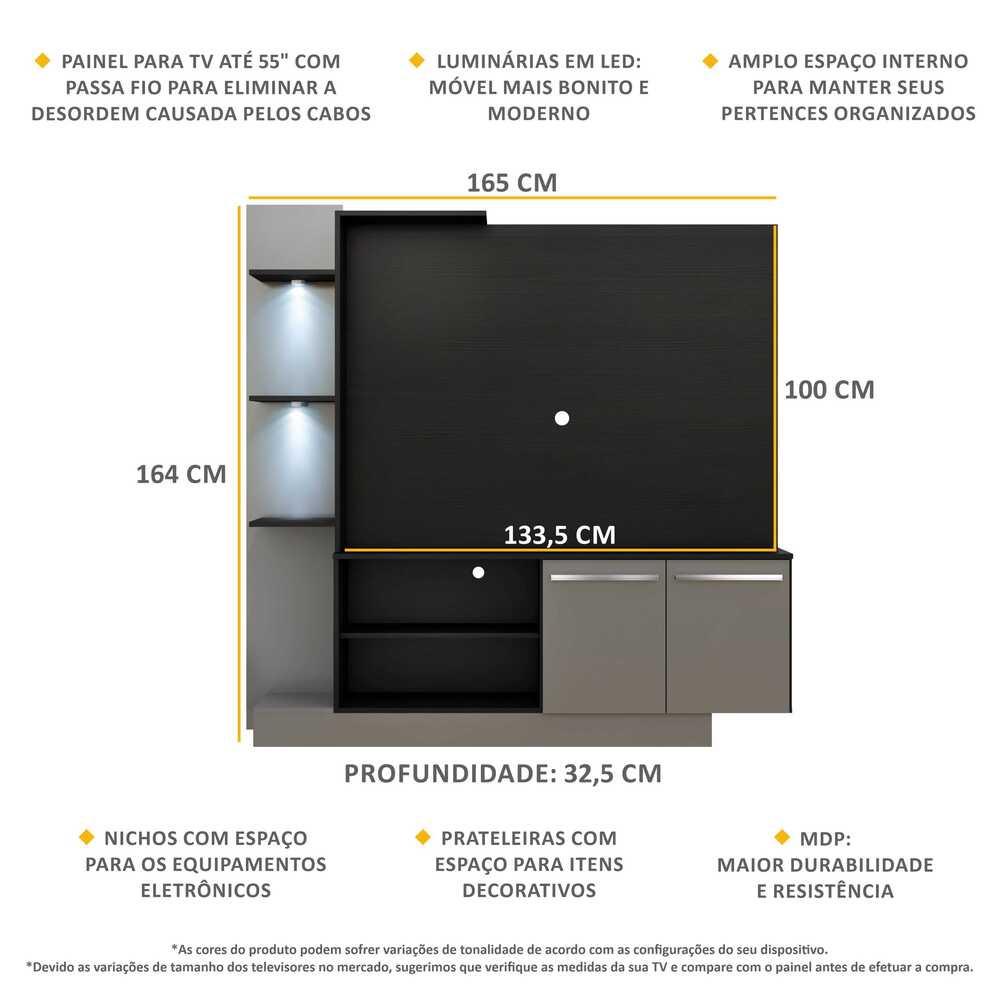 A Estante com 2 Leds Painel TV 55" e 2 portas Dallas Multimóveis é produzida em MDP, que garante maior durabilidade e resistência. As luminárias em LED, que acompanham a estante, proporcionam um visual mais bonito e moderno, deixando o ambiente aconchegante para você curtir os melhores filmes e séries. Com design minimalista e de fácil instalação, você pode escolher em qual lugar do móvel deseja fixar. Com luz brilhante, as luminárias funcionam com 3 pilhas AAA. O painel para TV de até 55” possui espaçamento para a passagem dos fios, que deixa o visual mais clean e os cabos organizados e a TV pode ser fixada no painel com o auxílio de um suporte (vendido separadamente), porém, neste caso, para maior segurança, sugerimos que a estante seja fixada na parede. Além das prateleiras que podem ser utilizadas para artigos decorativos, a estante possui nichos para acomodar os equipamentos eletrônicos e 2 portas com um amplo espaço interno para manter seus pertences organizados. Conteúdo da Embalagem: 1 (uma) estante 1 (um) Kit com 2 Luminárias LED Dimensões do produto montado: Altura: 164 cm - Largura: 165 cm - Profundidade: 32,5 cm Tamanho Painel TV: 133,5 x 100cm *Devido as variações de tamanho dos televisores no mercado, sugerimos que verifique as medidas da sua TV e compare com o painel antes de efetuar a compra. *Você pode consultar as medidas internas na imagem técnica do produto. Disponível em 2 opções de cores: Madeirado/Preto - Preto/Lacca Fumê Brilho *As cores do produto podem sofrer variações de tonalidade de acordo com as configurações do seu dispositivo. Imagem meramente ilustrativa. Decoração e eletros não acompanham o produto. O produto será entregue desmontado e não disponibilizamos o serviço de montagem.