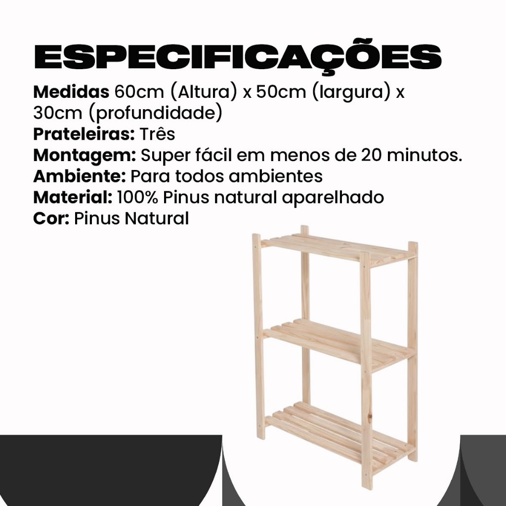 Estante com 3 Prateleiras de Madeira Maciça Pinus Movel Aparador Livros Frutas Cozinha Organizacao