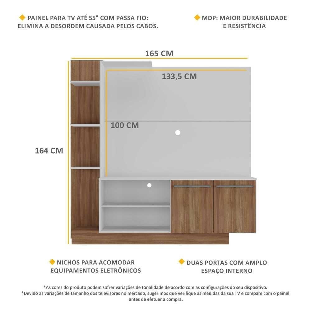Não tem nada melhor do que um ambiente bonito e organizado para receber as visitas, não é mesmo? A Estante com Painel TV 55" e 2 portas Denver Multimóveis vai deixar sua sala completa, enriquecendo ainda mais a decoração. Produzida em MDP, que garante maior durabilidade, resistência e facilidade na limpeza, possui painel para TV de até 55” (suporta até 26 Kg) com espaçamento para a passagem dos fios, que deixa o visual mais clean e os cabos organizados. Além das prateleiras que podem ser utilizadas para artigos decorativos, possui nichos para acomodar os equipamentos eletrônicos e 2 portas com um amplo espaço interno para manter seus pertences organizados. A TV pode ser fixada no painel com o auxílio de um suporte (vendido separadamente), porém, neste caso, para maior segurança, sugerimos que a estante seja fixada na parede. Conteúdo da Embalagem: 1 (uma) Estante Kit ferragem Manual de montagem Dimensões do produto montado: Altura: 164 cm - Largura: 165 cm - Profundidade: 32,5 cm Tamanho Painel TV: 133,5 x 100cm *Devido as variações de tamanho dos televisores no mercado, sugerimos que verifique as medidas da sua TV e compare com o painel antes de efetuar a compra. *Você pode consultar as medidas detalhadas na imagem técnica do produto. *As cores do produto podem sofrer variações de tonalidade de acordo com as configurações do seu dispositivo. Imagem meramente ilustrativa. Decoração e eletros não acompanham o produto. O produto será entregue desmontado e não disponibilizamos o serviço de montagem.