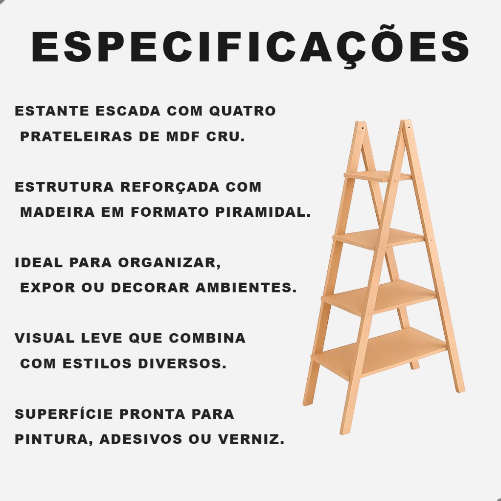 Estante decorativa modelo escada com quatro prateleiras em MDF cru. Estrutura reforçada, estável e com visual leve. Ideal para apoio de doces, exposição de produtos, decoração de festas ou organização de ambientes internos. Benefícios para Adquirir Design piramidal elegante e moderno Quatro prateleiras para melhor aproveitamento do espaço Estrutura firme, estável e de fácil montagem Superfície pronta para pintura, adesivos ou verniz Multiuso: ideal para festas, vitrines, casas e eventos Características Técnicas Modelo: Escada com 4 andares em MDF Material: MDF Altura: 117 cm Largura: 60 cm Profundidade: 30 cm Prateleiras: 4 níveis (fixos) Utilização Indicada Exposição de doces e lembrancinhas em festas Decoração de vitrines e ambientes internos Organização de objetos decorativos Customização para uso em eventos temáticos Itens para Envio Produto enviado desmontado Acompanha parafusos para fixação Montagem simples, com encaixe e fixação lateral Cuidados Limpar com pano seco Evitar contato com umidade Montar em superfície firme e plana Recomendada personalização com tinta à base d'água, PVA ou spray Garanta agora sua estante tipo escada com 4 prateleiras em MDF e transforme qualquer espaço com um toque funcional, elegante e criativo.