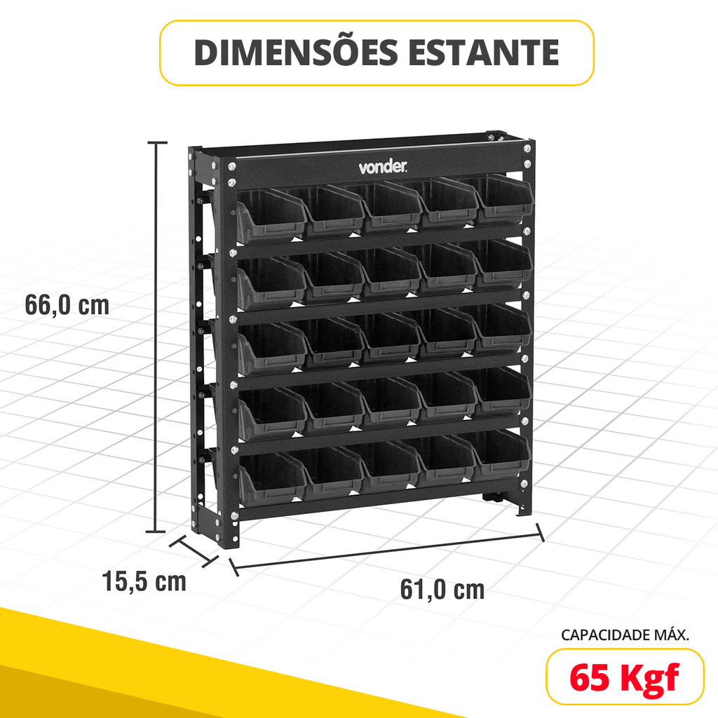 Estante Gaveteira Vonder 25 Gavetas Nº3 Preta para Oficina Peças e Parafusos ---------- CONTEÚDO DO ANÚNCIO ---------- - 1 x Estante Gaveteira Vonder com 25 Gavetas Nº3 inclusas ---------- INFORMAÇÕES ---------- Organize seu espaço de trabalho com praticidade e resistência! A Estante Metálica com 25 Gaveteiros Nº 3 é ideal para armazenar e organizar peças, parafusos, ferragens e pequenos componentes. Com estrutura em chapa metálica pintada, oferece alta durabilidade e proteção contra corrosão/oxidação. Produto vendido desmontado, em embalagem compacta. Acompanha todos os parafusos e porcas para montagem. ---------- PRINCIPAIS CARACTERÍSTICAS ---------- - Organização prática para oficinas, garagens e indústrias - Estrutura metálica resistente e durável - Gaveteiros removíveis para fácil acesso - Capacidade total de 65 kg - Design compacto que otimiza espaço ---------- DADOS TÉCNICOS ---------- - Quantidade de gaveteiros: 25 unidades Nº 3 (cor preta) - Material da estante: Chapa metálica pintada - Dimensões da estante montada: 66 cm (altura) x 61 cm (largura) x 15,5 cm (profundidade) - Cor da estante: Preta - Peso aproximado: 4,69 kg - Garantia: 90 dias (legal – CDC) ---------- ATENÇÃO ---------- Produto vendido desmontado, em embalagem compacta. Acompanha todos os parafusos e porcas para montagem. PERGUNTAS FREQUENTES: - Tem a pronta entrega? Sim, todos os produtos anunciados têm estoque para envio imediato. - Qual o prazo de postagem? Após a confirmação da compra, seu produto será postado no máximo 1 dia útil. estante metálica com gaveteiros, organizador de peças, estante para oficina, estante para parafusos, gaveteiro industrial, estante Vonder, estante 25 gavetas, organizador de ferragens.