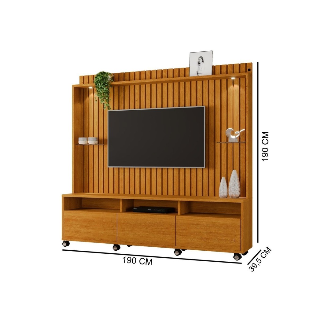 Transforme a sua sala de estar com a Estante Home Absoluto, seu design ripado confere um toque contemporâneo, enquanto a iluminação LED embutida adiciona um brilho envolvente. Com três gavetas, você pode organizar seus itens com facilidade, mantendo a ordem no espaço. As prateleiras proporcionam um local elegante para exibir objetos de decoração.A combinação de materiais premium, como madeira ripada, vidro e iluminação LED, cria um contraste sofisticado que eleva o charme da sua sala. Construída com foco na funcionalidade e estética, o home se adapta harmoniosamente a diversos estilos de decoração. A facilidade de montagem permite que você desfrute rapidamente do novo visual da sua sala. Realce seu espaço de convivência com essa estante versátil, unindo beleza, praticidade e tecnologia. Garantia: 03 Meses Acabamento: Pintura UV Largura (cm): 190 Possui Pés: Não Possui Vidro: Sim Possui Portas: Não Possui Gavetas: Sim Possui Rodízio: Sim Suporta Até (kg): 40 Possui Espelhos: Não Escala de Brilho: Fosco Gaveta com Chave: Não Material dos Pés: Plástico Origem do Produto: Nacional Possui Iluminação: Sim Rodízio com Trava: Sim Acabamento dos Pés: Cromado Ambiente Principal: Sala de Estar Material da Gaveta: MDF/MDP Material Principal: MDF/MDP Possui Prateleiras: Sim Sapatas Niveladoras: Não Acabamento da Gaveta: Pintura UV Material da Prateleira: MDF/MDP Peso Máximo por Gaveta: 3 Acabamento da Prateleira: Pintura UV Painel para TV Integrado: Sim Tipo de Puxador da Gaveta: Embutido Escala de Brilho da Gaveta: Fosco Peso Máximo por Prateleira: 3 Tipo de Corrediça da Gaveta: Metálica Telescópica Ideal para TVs até (Polegadas): 60 Escala de Brilho da Prateleira: Fosco Suporte de TV Universal Incluso: Não Marca: Carmolar Cor Flex: Não Cor: Naturale Cor do Produto: Naturale Itens Inclusos: 01 Home e 01 Manual de Montagem Cor Predominante: Marrom Quantidade de Prateleiras: 02 Prateleiras