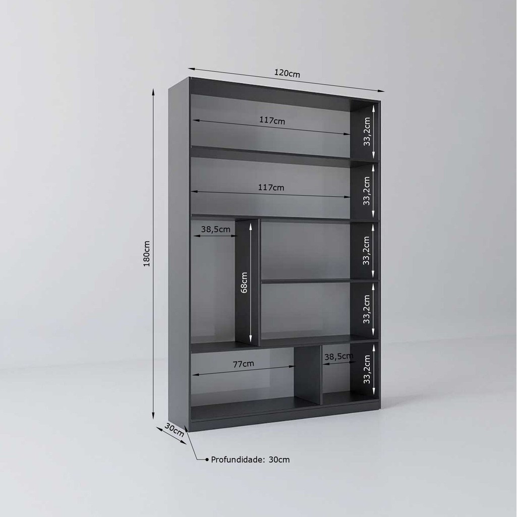 Imagine um móvel que além de organizar os seus objetos, deixe seus ambientes com aquele toque a mais na decoração. Seu desejo pode ser atendido com a Estante Livreiro Multiuso Seattle, um móvel que além de imponente possui uma funcionalidade que atende diferentes espaços e objetivos, pois conta com 8 espaçosos nichos para você organizar o quiser. Não perca a chance e garanta já a sua! Estilo: Moderno Peso (kg): 37 Garantia: 03 Meses Altura (cm): 180 Acabamento: Melamínico Largura (cm): 120 Possui Pés: Sim Possui Vidro: Não Possui Portas: Não Altura dos Pés: 1.5 Possui Gavetas: Não Possui Rodízio: Não Suporta Até (kg): 30 Possui Espelhos: Não Profundidade (cm): 30 Escala de Brilho: Semi-Brilho Material dos Pés: Plástico Origem do Produto: Nacional Possui Iluminação: Não Acabamento dos Pés: BP Ambiente Principal: Sala de Estar Material Principal: MDP Possui Prateleiras: Sim Quantidade de Itens: 1 Sapatas Niveladoras: Não Material da Prateleira: MDP Acabamento da Prateleira: Melamínico Peso Máximo por Prateleira: 5 Escala de Brilho da Prateleira: Semi-Brilho Informações Complementares (Novo): O produto não possui a opção de montagem flex dos nichos e prateleiras Possui Acabamento na Parte de Trás: Não Marca: Yescasa Cor Flex: Não Cor Interna: Preto Cor: Preto Cor do Produto: Preto Itens Inclusos: 1 Estante Livreiro + Kit de Ferragens + Manual de Montagem Cor Predominante: Preto Quantidade de Prateleiras: 05 Prateleiras