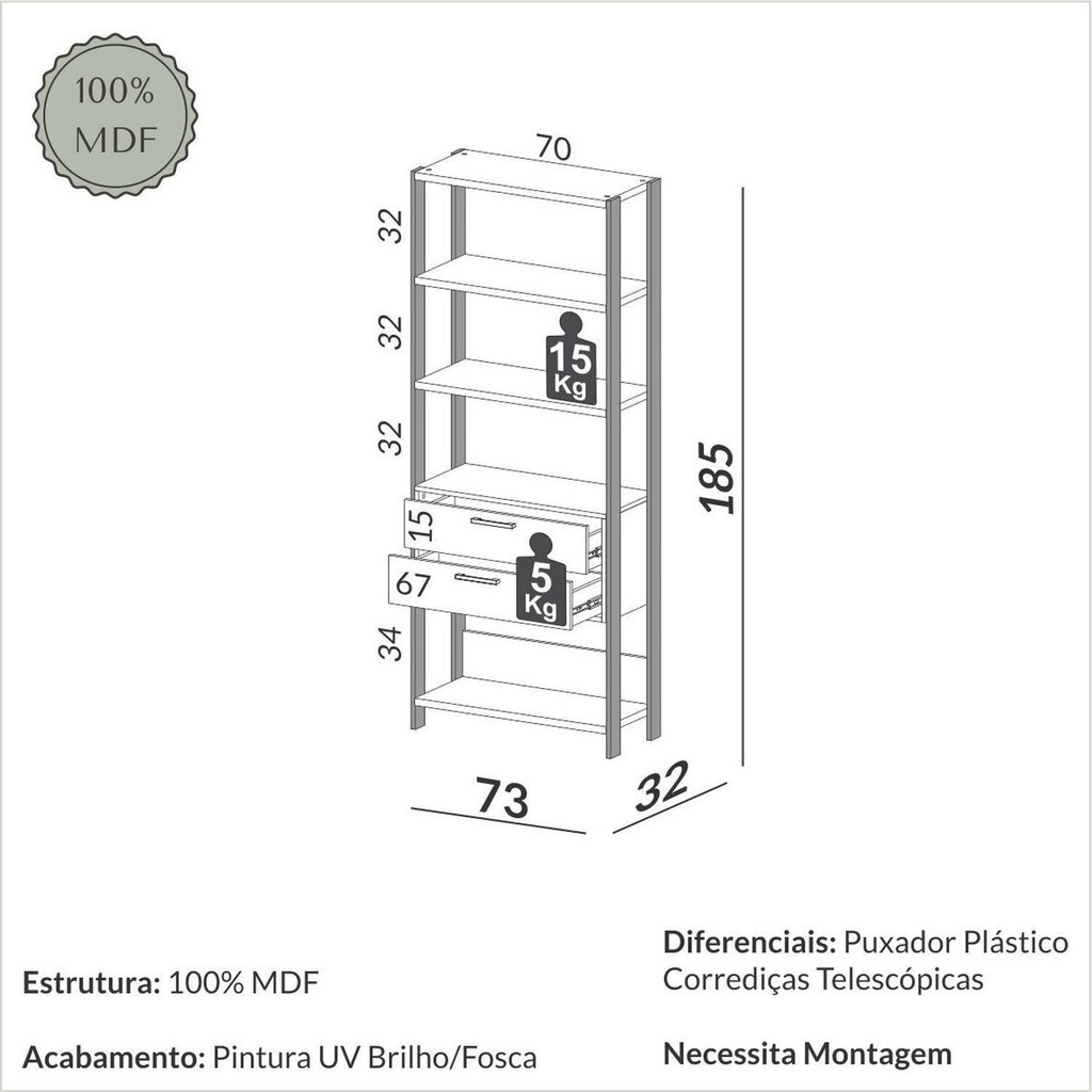 Estante Dalla Costa 1 torre com gaveteiro 73cm - cor off white,freijo, 100% MDF, para maior durabilidade é aplicado 6 camadas de pintura UV, linda e moderna estante ideal para seu ambiente, conheça toda linha da Dalla Costa. Estilo: Moderno Peso (kg): 27 Garantia: 03 Meses Altura (cm): 185 Acabamento: Pintura UV Largura (cm): 73 Possui Pés: Não Possui Vidro: Não Possui Portas: Não Tipo de Porta: Basculante Possui Gavetas: Sim Possui Rodízio: Não Suporta Até (kg): 20 Possui Espelhos: Não Profundidade (cm): 32 Escala de Brilho: Brilhante Material dos Pés: MDF Serviço Montagem: 114259443 Material da Porta: MDF Origem do Produto: Nacional Possui Iluminação: Não Rodízio com Trava: Não Acabamento dos Pés: Pintura Ambiente Principal: Escritório Material da Gaveta: MDF Material Principal: MDF Possui Prateleiras: Sim Acabamento da Porta: Pintura UV Quantidade de Itens: 1 Sapatas Niveladoras: Não Acabamento da Gaveta: Pintura Material da Prateleira: MDF Peso Máximo por Gaveta: 2 Acabamento da Prateleira: Pintura Painel para TV Integrado: Não Tipo de Puxador da Porta: Externo Escala de Brilho da Porta: Brilhante Tipo de Puxador da Gaveta: Externo Escala de Brilho da Gaveta: Brilhante Peso Máximo por Prateleira: 5 Tipo de Corrediça da Gaveta: Metálica Telescópica Material do Puxador da Porta: Plástico Material do Puxador da Gaveta: Plástico Escala de Brilho da Prateleira: Brilhante Possui Acabamento na Parte de Trás: Sim Tipo de Dobradiça/Corrediça da Porta: Metálica Marca: Pradel Móveis Cor Interna: Off White Cor: Freijó/Off White Cor do Produto: Freijó/Off White Itens Inclusos: 1 Estante e Manual de Montagem Cor Predominante: Branco Quantidade de Prateleiras: 03 Prateleiras Quantidade de Gavetas: 02 Gavetas