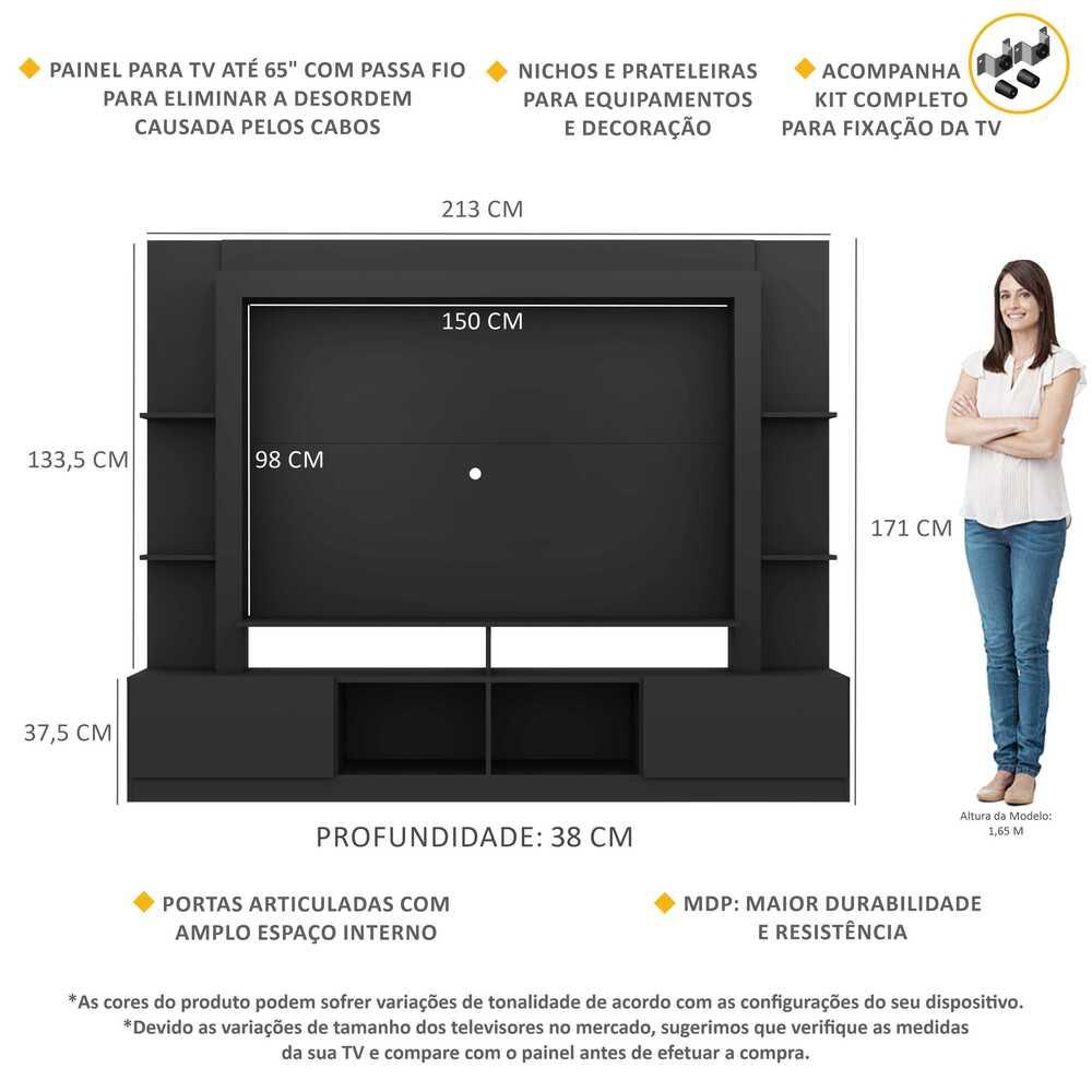 A Estante Rack com Painel e Suporte TV 65" Moscou Multimóveis é perfeita para deixar sua sala de estar moderna, aconchegante e linda para receber os amigos e curtir os melhores filmes e séries. Produzida em MDP com acabamento acetinado (cerca de 20% de brilho), que garante maior durabilidade e facilidade na limpeza, além de um acabamento superior, possui 2 portas articuladas com um excelente espaço interno para organizar seus pertences. Com prateleiras para que você possa personalizar a decoração, deixando-a do seu estilo e nichos para acomodar todos os equipamentos, o painel com suporte para TV de até 65” (suporta até 30kg) possui espaçamento para passagem dos fios, que permite deixar os cabos mais organizados. Para facilitar a sua vida, este produto acompanha também o kit para fixação da TV. Muito prático e de fácil instalação, pode ser utilizado para TV’s LCD, LED e plasma de 14” a 71”. Totalmente sobreposto, acompanha gabarito de montagem que auxilia na instalação. Conta com um sistema de encaixe rápido, possui 16mm de deslocamento que permite o ajuste do encaixe das peças. Conteúdo da Embalagem: 1 (uma) estante 1 (um) kit com suporte TV Dimensões do produto montado: Altura: 171cm | Largura: 213cm | Profundidade: 38cm Painel - Altura: 98cm | Largura: 150cm *Devido as variações de tamanho dos televisores no mercado, sugerimos que verifique as medidas da sua TV e compare com o painel antes de efetuar a compra. *Você pode consultar as medidas internas na imagem técnica do produto. *As cores do produto podem sofrer variações de tonalidade de acordo com as configurações do seu dispositivo. Imagem meramente ilustrativa. Decoração e eletros não acompanham o produto. O produto será entregue desmontado e não disponibilizamos o serviço de montagem.
